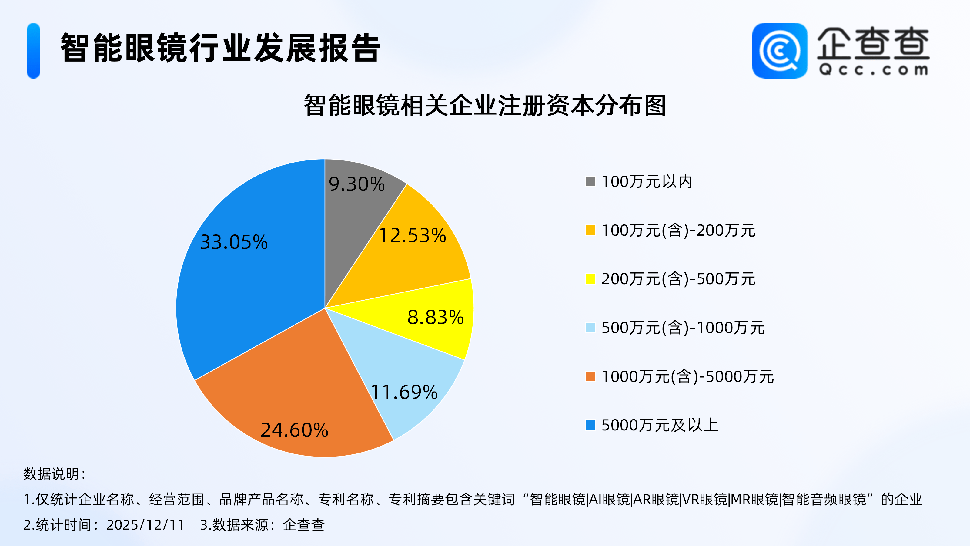 企查查數據顯示,從注冊資本來看,智能眼鏡相關企業多為資金密集型企業,注冊資本在千萬級以上的相關企業過半,其中在5000萬元以上的相關企業最多,占比33.05%。其次,注冊資本在1000萬元(含)-5000萬元的相關企業占比24.60%。