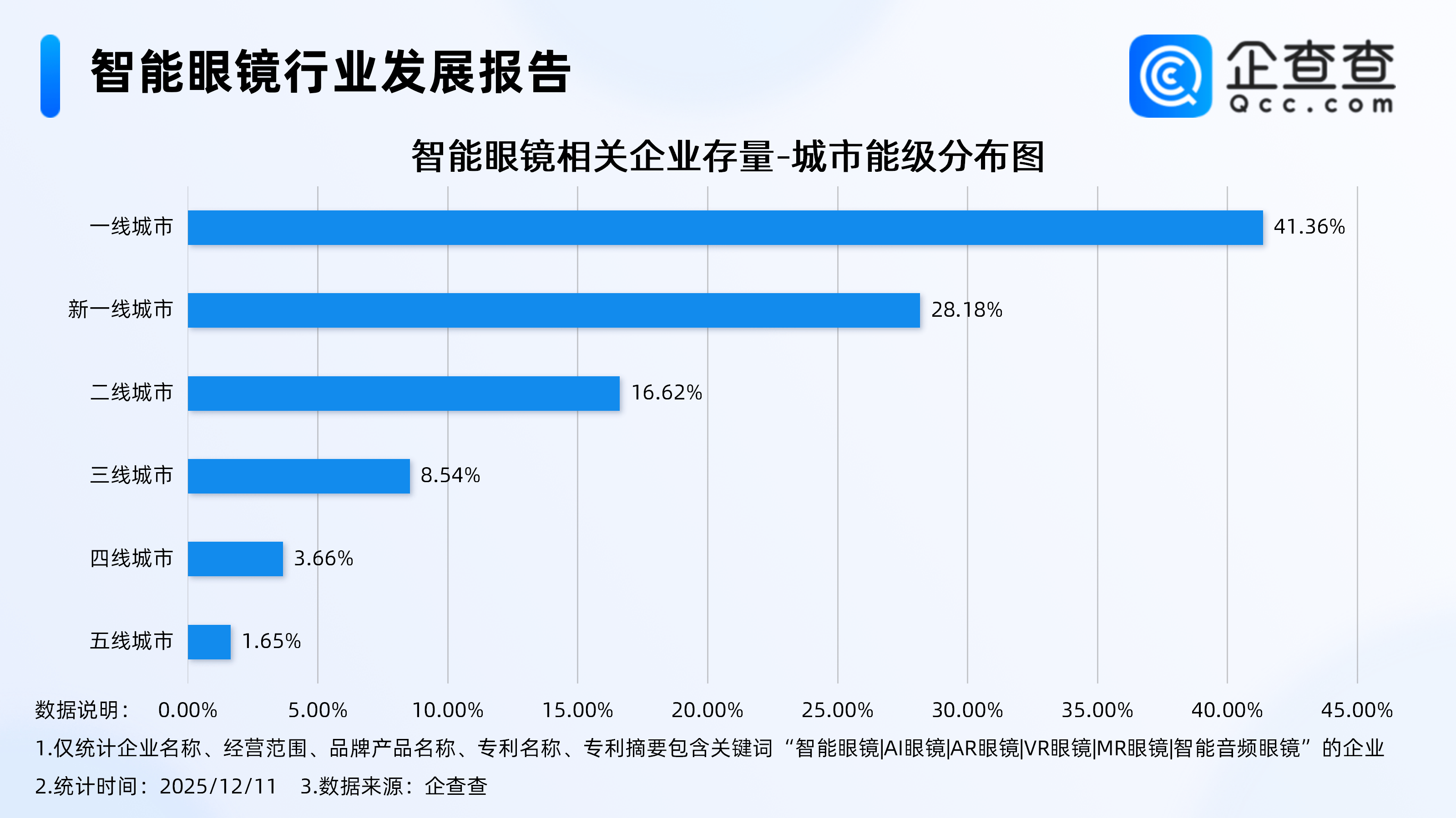 企查查數據顯示,截至12月11日,國內現存智能眼鏡相關企業5778家。存量方面,從經營時間來看,智能眼鏡相關企業多為老牌企業,成立年限在10年以上的相關企業占比過半,達50.02%。從注冊資本來看,智能眼鏡相關企業多為資金密集型企業,注冊資本在千萬級以上的相關企業過半,其中注冊資本在5000萬元以上的相關企業最多,占比33.05%。從城市能級分布來看,現存智能眼鏡相關企業較多分布在一線城市,占比41.36%。注冊量方面,2024年全年注冊相關企業61家,截至目前,今年已注冊30家。