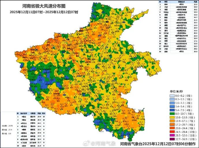 伴隨著強(qiáng)冷空氣抵達(dá)河南,12月11日7時(shí)至12日7時(shí),全省大部地區(qū)出現(xiàn)6到7級(jí)極大風(fēng),新鄉(xiāng)、焦作、濟(jì)源、三門(mén)峽、洛陽(yáng)、鄭州、許昌、南陽(yáng)等地局部8到10級(jí)。