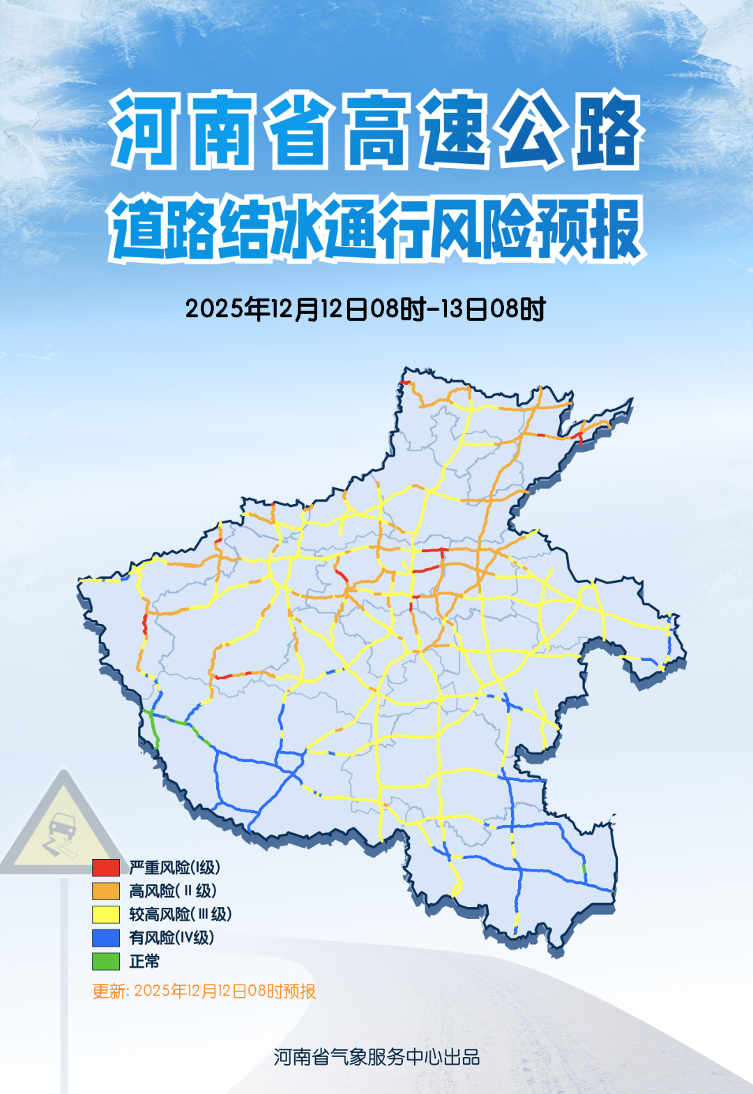 受降雪影響,今天全省大部地區(qū)高速公路有較高道路結(jié)冰通行風(fēng)險(xiǎn),其中,西部、中部局部有嚴(yán)重風(fēng)險(xiǎn),注意出行安全。