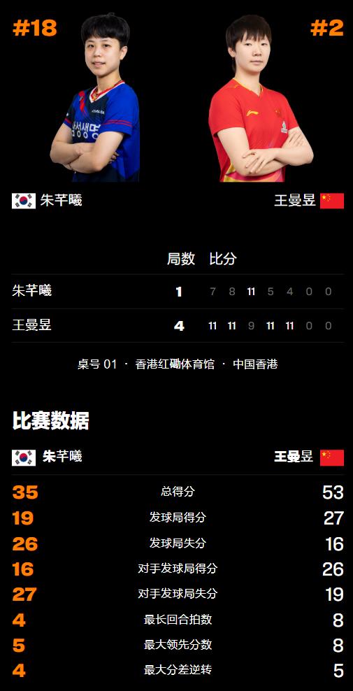 第四局朱芊曦狀態(tài)崩盤連丟8分,隨后通過一個擦邊運(yùn)氣球才止住連敗,但最終還是無力改變頹勢,王曼昱隨即以10-3拿到局點(diǎn)并最終以11-5取勝,再贏一局即可結(jié)束戰(zhàn)斗。