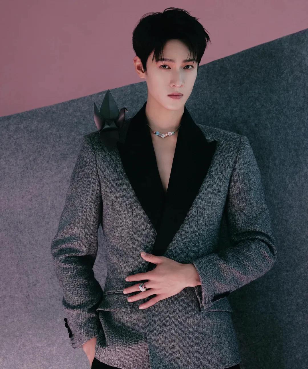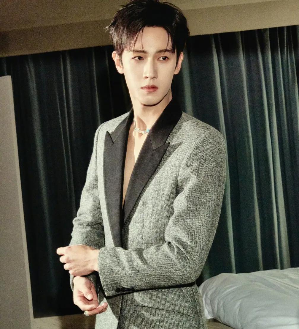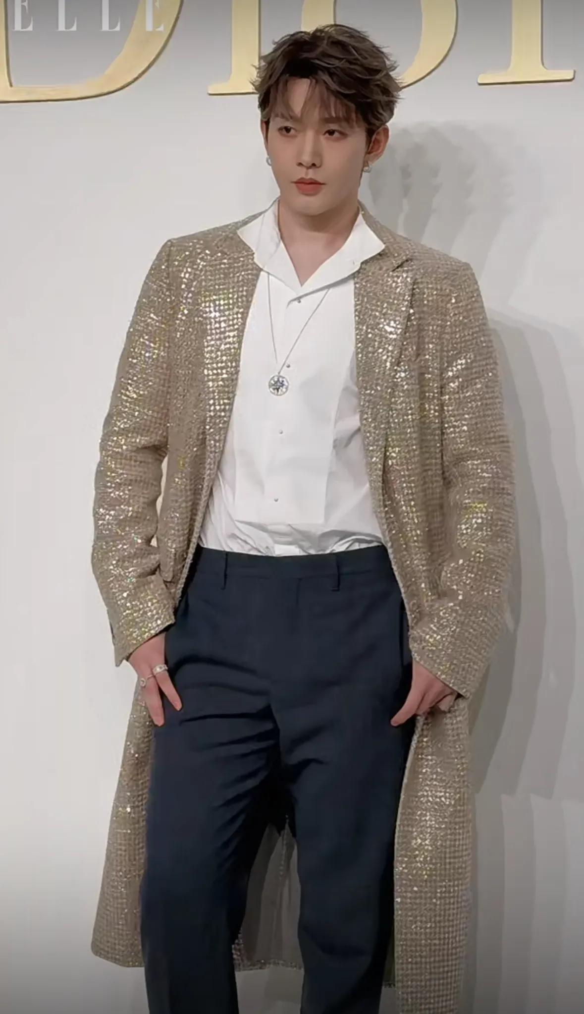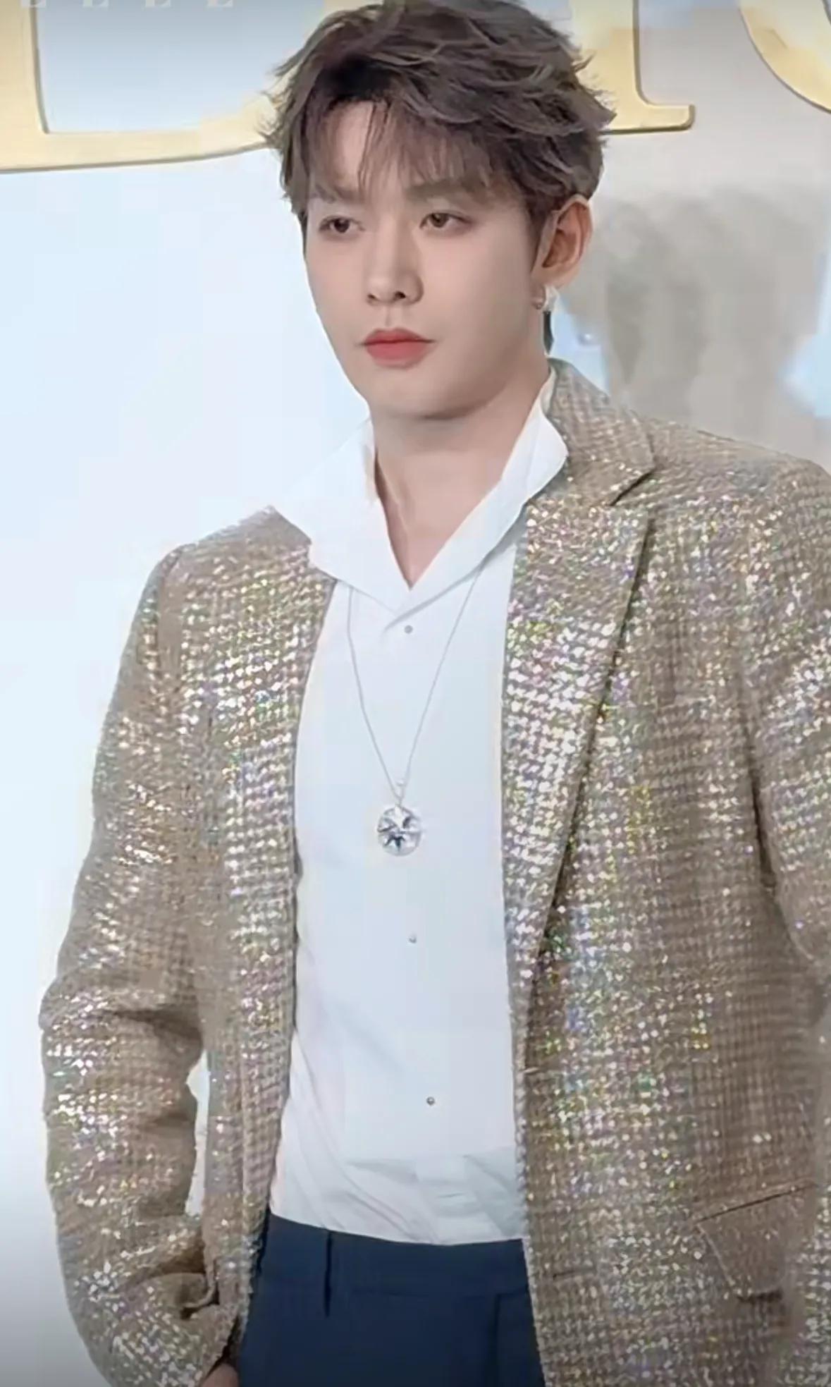 鄧為,他也是近期被品牌鐘愛的流量小生,穿著金色西裝外套,很精致。