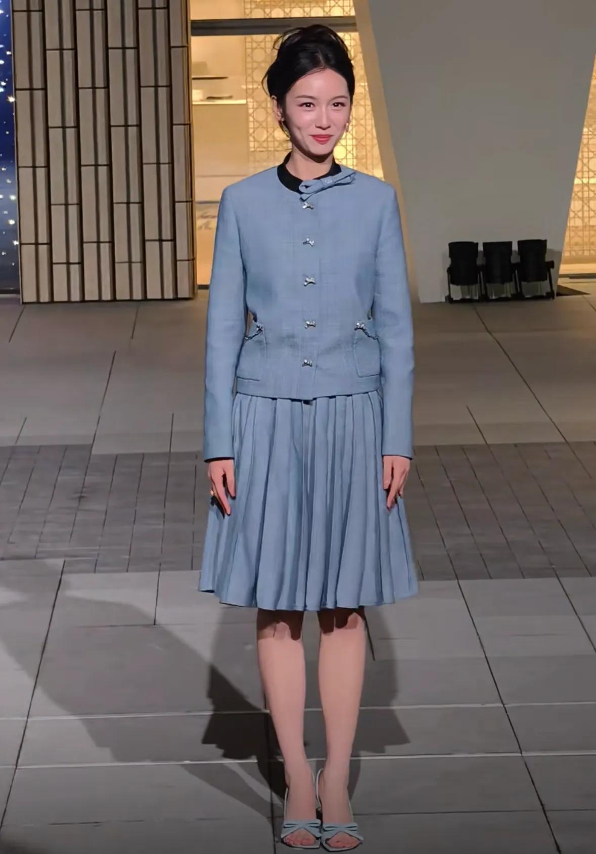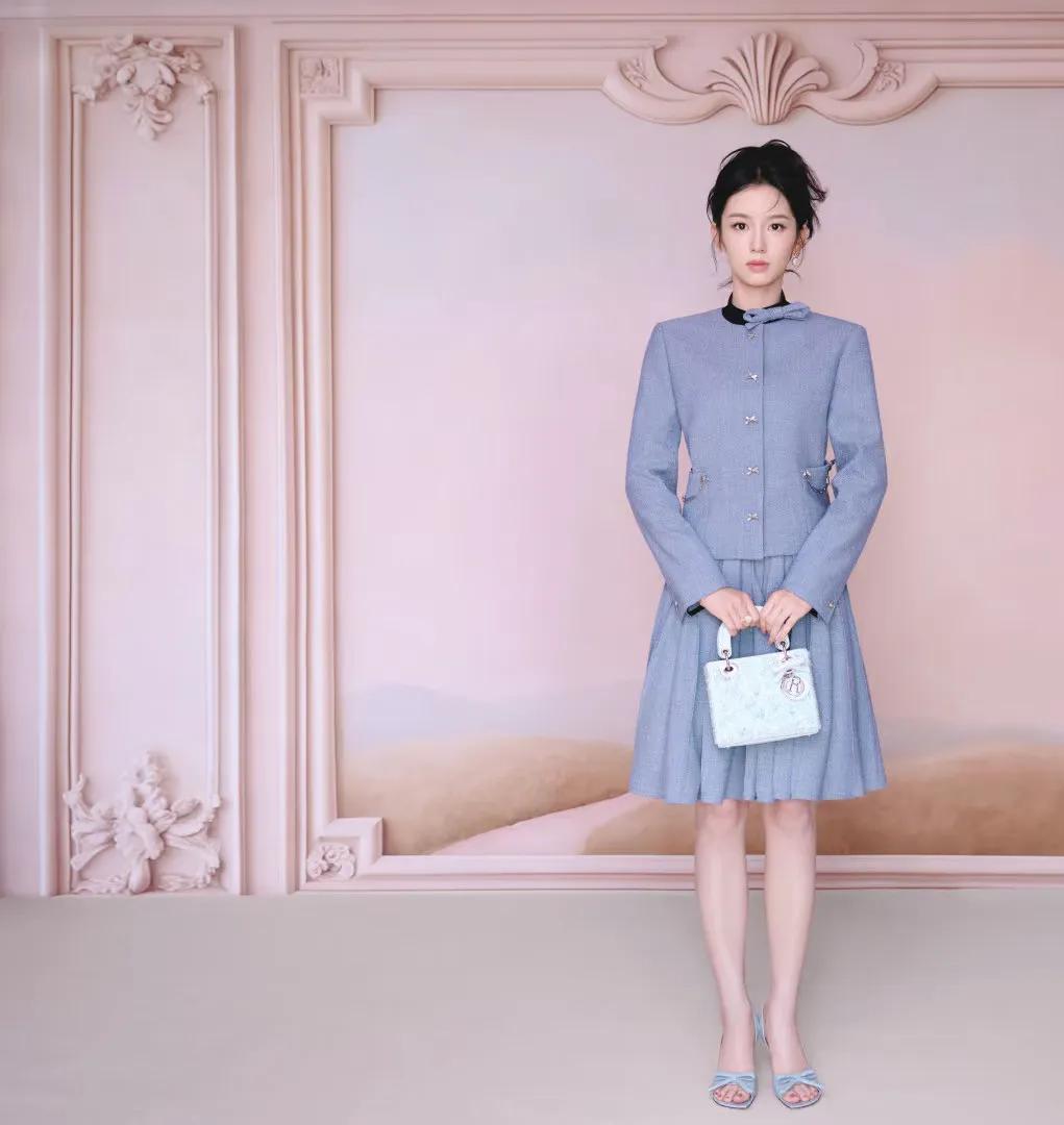 周也,她是品牌方最愛的95后小花,多次現(xiàn)身巴黎時裝周,這一次一身藍色套裝,很清新淡雅。