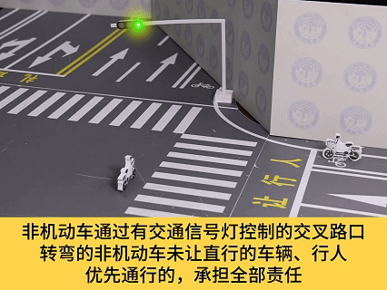 《中華人民共和國道路交通安全法實(shí)施條例》第六十八條 非機(jī)動(dòng)車通過有交通信號燈控制的交叉路口,應(yīng)當(dāng)按照下列規(guī)定通行:轉(zhuǎn)彎的非機(jī)動(dòng)車讓直行的車輛、行人優(yōu)先通行。第七十二條 轉(zhuǎn)彎前應(yīng)當(dāng)減速慢行,伸手示意,不得突然猛拐,超越前車時(shí)不得妨礙被超越的車輛行駛。