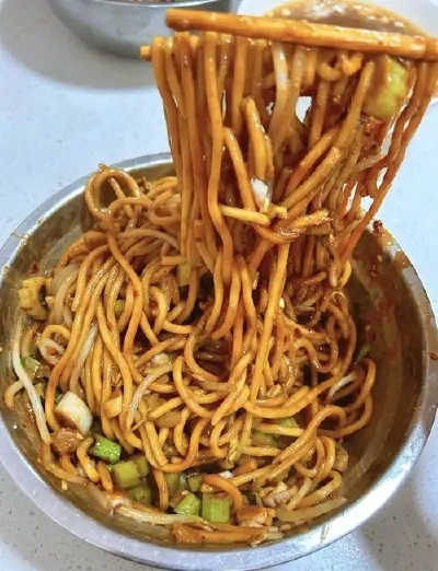 粗瓷碗還燙著手,深褐色的芝麻醬像綢緞般裹著每一根堿水面。老板撒上脆蘿卜丁、蔥花、酸豆角的動作利落得像在完成某種儀式。拌開的瞬間,芝麻醬香猛地竄進鼻腔——那香氣是厚重的、帶著烘烤過的堅果氣息,卻又被酸豆角的清爽輕輕托著,不讓人覺得膩。