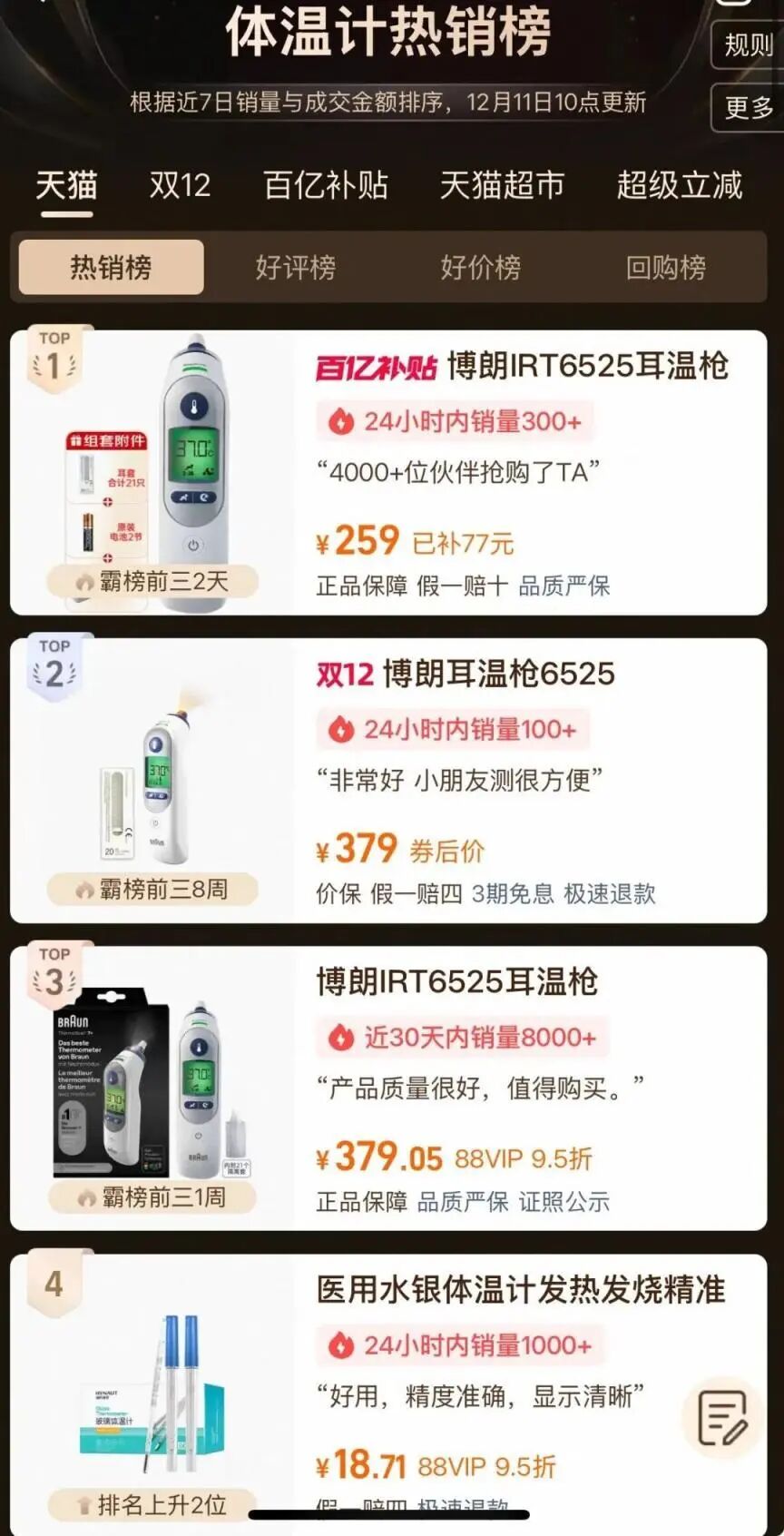 前幾天翻購物平臺的“體溫計熱銷榜”,我嚇了一跳:前三位都是耳溫槍,好評榜榜首也是一款嬰兒電子體溫計。而水銀體溫計,早就不在熱銷榜前列了。這說明,越來越多的人選擇了電子體溫計,但還是有很多人對它有誤解:“電子的根本不準!”“我家電子的測出來比水銀的低一度!”