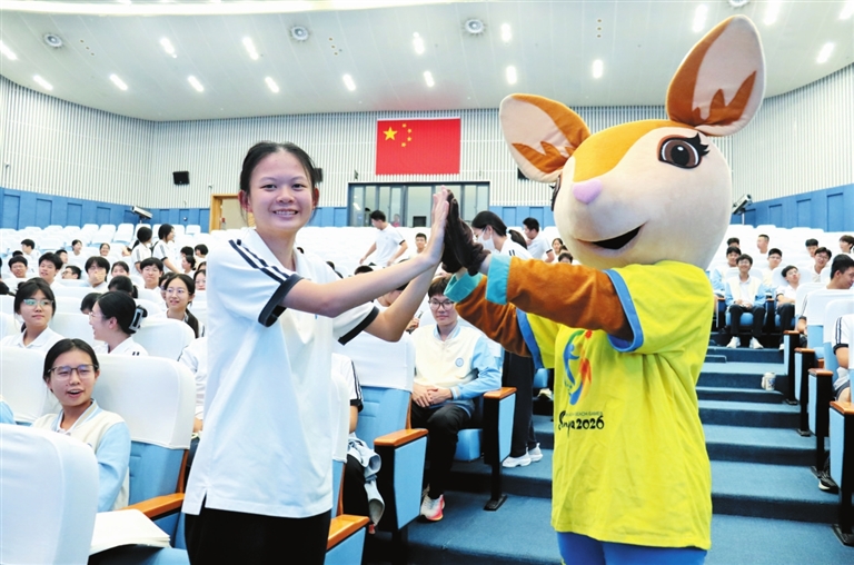 “哇,好可愛!”12月10日下午,上海外國語大學三亞附屬中學禮堂內,隨著一陣歡呼聲響起,全場300余名學生的目光被吸引至臺前。第六屆亞洲沙灘運動會(以下簡稱:三亞亞沙會)吉祥物“亞亞”亮相,瞬間點燃了會場的熱情。這場充滿活力的相遇,既拉近了三亞亞沙會與青少年的距離,也正式拉開了本次“亞沙知識課堂”序幕。