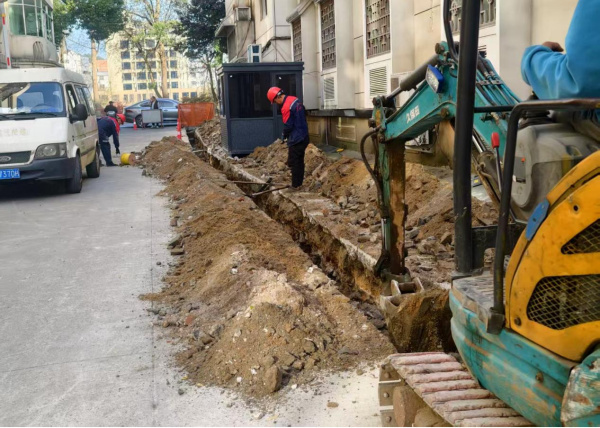 面對嚴寒天氣,施工挑戰(zhàn)顯著增加。在各小區(qū)現(xiàn)場,從清晨的管網(wǎng)鋪設(shè)到深夜的設(shè)備調(diào)試,處處是施工人員忙碌的身影。他們身著厚重工裝,在寒風中精準完成開挖、焊接、安裝等每一道工序。為減少對居民生活的影響,團隊采用“集中施工、分段推進”模式,優(yōu)化方案、避開高峰,并在管線密集區(qū)運用“機械清表 + 人工精挖”的精細化作業(yè)方式,兼顧安全與效率。