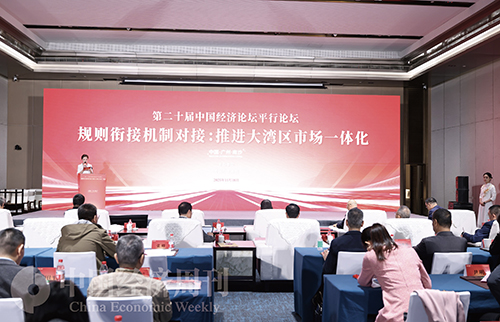11月18日,“規則銜接機制對接:推進大灣區市場一體化”論壇在廣東廣州南沙國際會展中心舉行,這是第二十屆中國經濟論壇的一場平行論壇。廣東省有關部門,大灣區內地九市政府各部門,橫琴、前海、南沙和河套四大平臺代表,大灣區企業家代表,業內專家學者共聚一堂,為縱深推進大灣區市場一體化建言獻策。