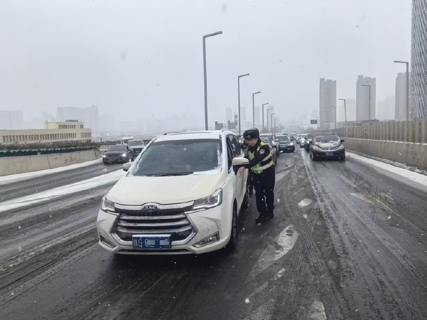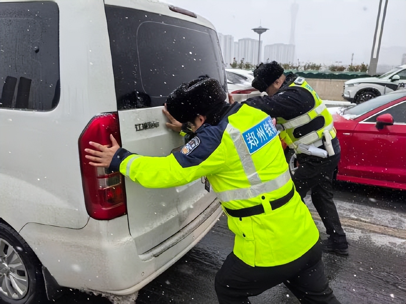 △鄭州交警四大隊聞雪即動,趕赴隴海高架積雪路段,全力協助受困車輛脫困,保障道路通行安全。
