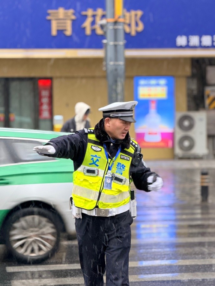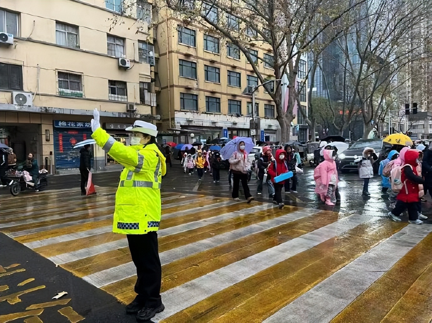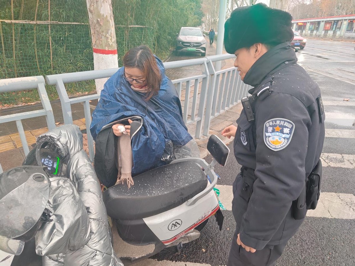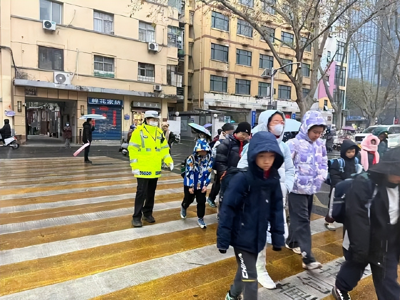 △鄭州交警九大隊民警輔警雪中“護學”,確保校園周邊道路交通安全暢通。