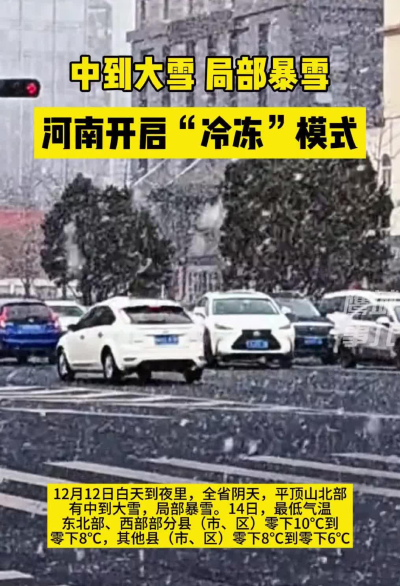 今天白天到夜里,全省陰天,安陽、鶴壁、新鄉、焦作、濟源、三門峽、洛陽、鄭州、開封西部、許昌、平頂山北部有中到大雪,局部暴雪;南陽西南部、信陽東部有小雨或雨夾雪;其他縣(市、區)雨夾雪轉中到大雪,局部暴雪。全省偏北風轉偏西風4級左右,陣風6到7級,西部、西北部局部8到9級。最高氣溫:北部、中西部零下2℃到0℃;南部5到7℃;其他縣(市、區)0到2℃。最低氣溫:北部、中西部零下6℃到零下4℃;南部0℃左右;其他縣(市、區)零下4℃到零下2℃。