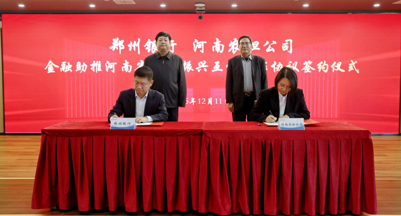 12月11日,河南農擔公司與鄭州銀行簽署戰略合作協議。河南農擔公司黨委書記、董事長張旻晟,總經理、黨委副書記張宣義,鄭州銀行黨委書記、董事長趙飛出席簽約儀式。河南農擔公司黨委委員、副總經理郝蓓,鄭州銀行副行長孫潤華代表雙方簽署合作協議。