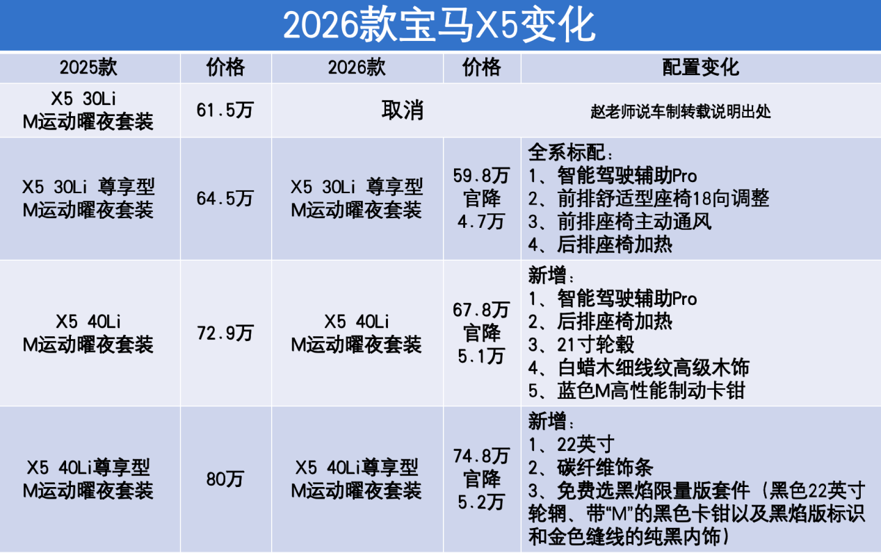 2、3.0T的寶馬X5入門版除了新增的駕駛輔助Pro、后排座椅加熱,還有21寸輪轂,藍色M卡鉗,白蠟木內飾,官方指導價相比于老款寶馬X5降了5.1萬,2026款寶馬X53.0T入門指導價是67.8萬,因為老款3.0T車不多,所以11月份開始生產的就屬于2026款了,這配置不錯,但是目前優惠不大,想要優惠大一些估計得等等了,不過3.0T的寶馬X5現在產量不多,后期價格走勢還要看消費者買不買六缸發動機的賬了!