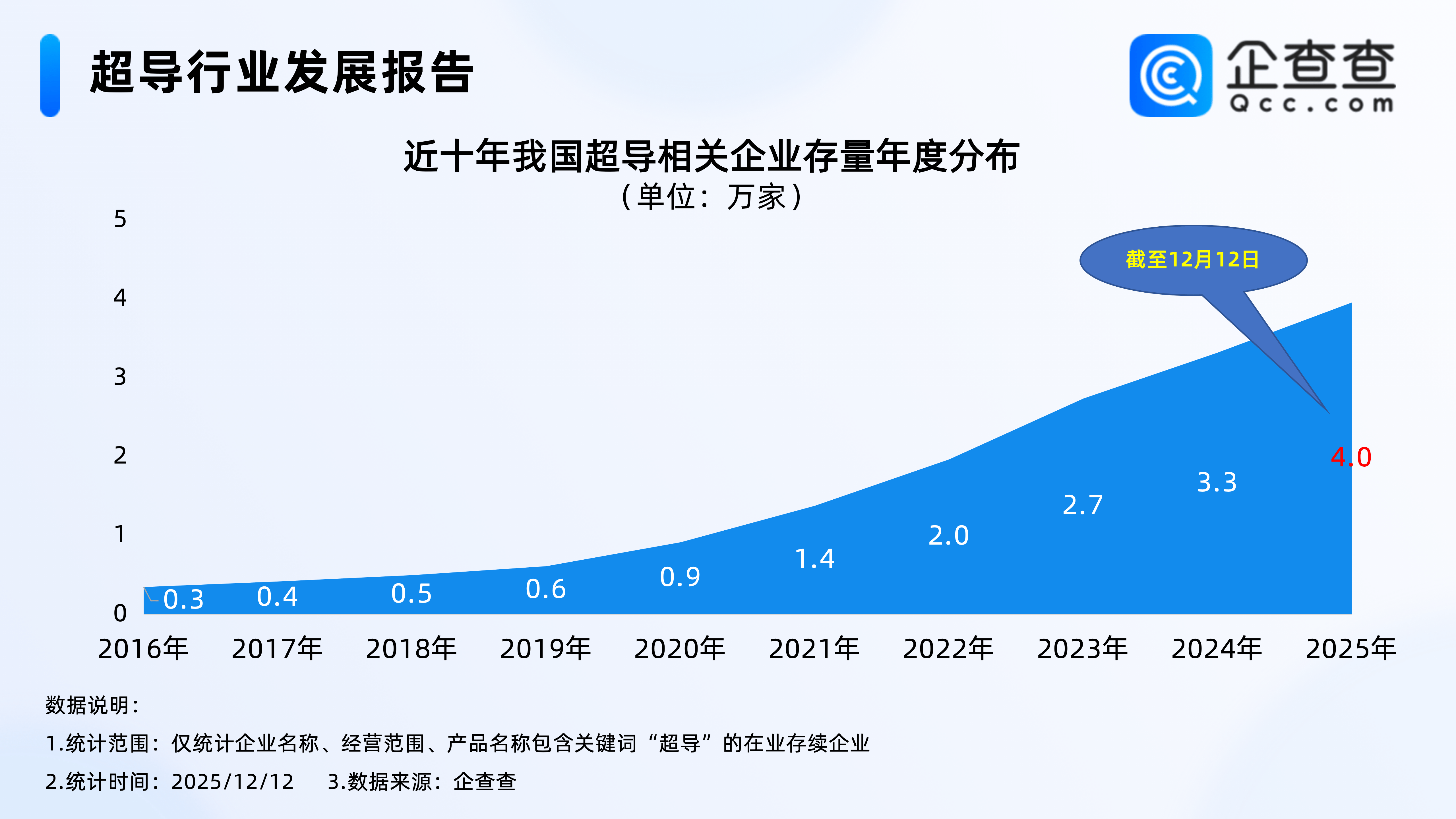 企查查數(shù)據(jù)顯示,2016年開始,我國超導相關(guān)企業(yè)存量穩(wěn)步增加。截至2019年末,相關(guān)企業(yè)存量達0.6萬家。2020年開始,超導相關(guān)企業(yè)存量增速加快,截至2023年末超導相關(guān)企業(yè)存量達2.7萬家;截至2025年12月12日,我國現(xiàn)存4.0萬家超導相關(guān)企業(yè)。