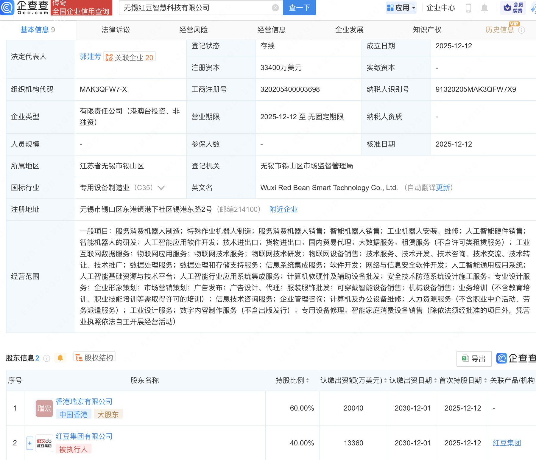企查查APP顯示,近日,無錫紅豆智慧科技有限公司成立,注冊資本3.34億美元,經營范圍包含:人工智能硬件銷售;智能機器人的研發;人工智能應用軟件開發;人工智能基礎資源與技術平臺等。企查查股權穿透顯示,該公司由紅豆集團有限公司等共同持股。