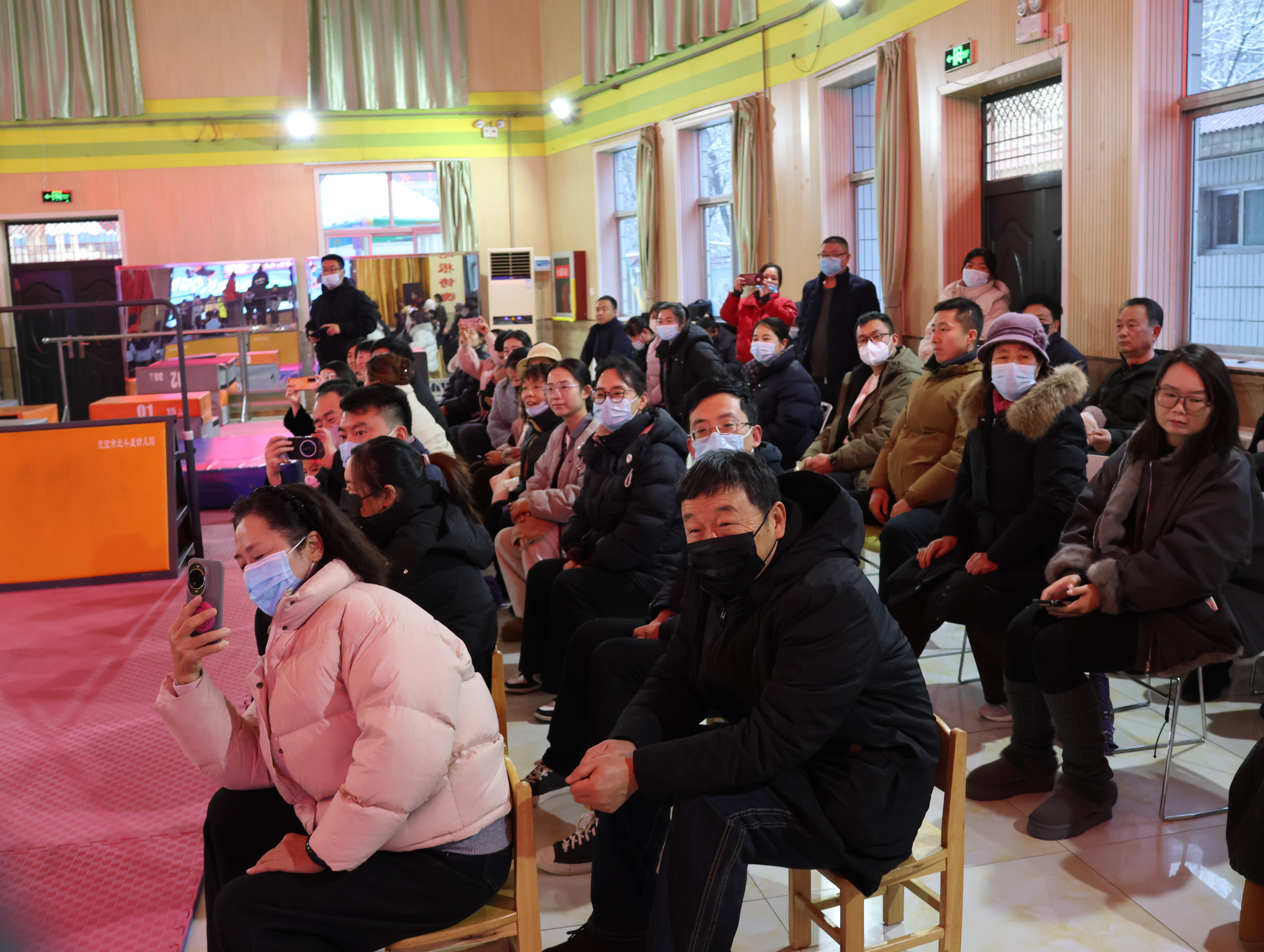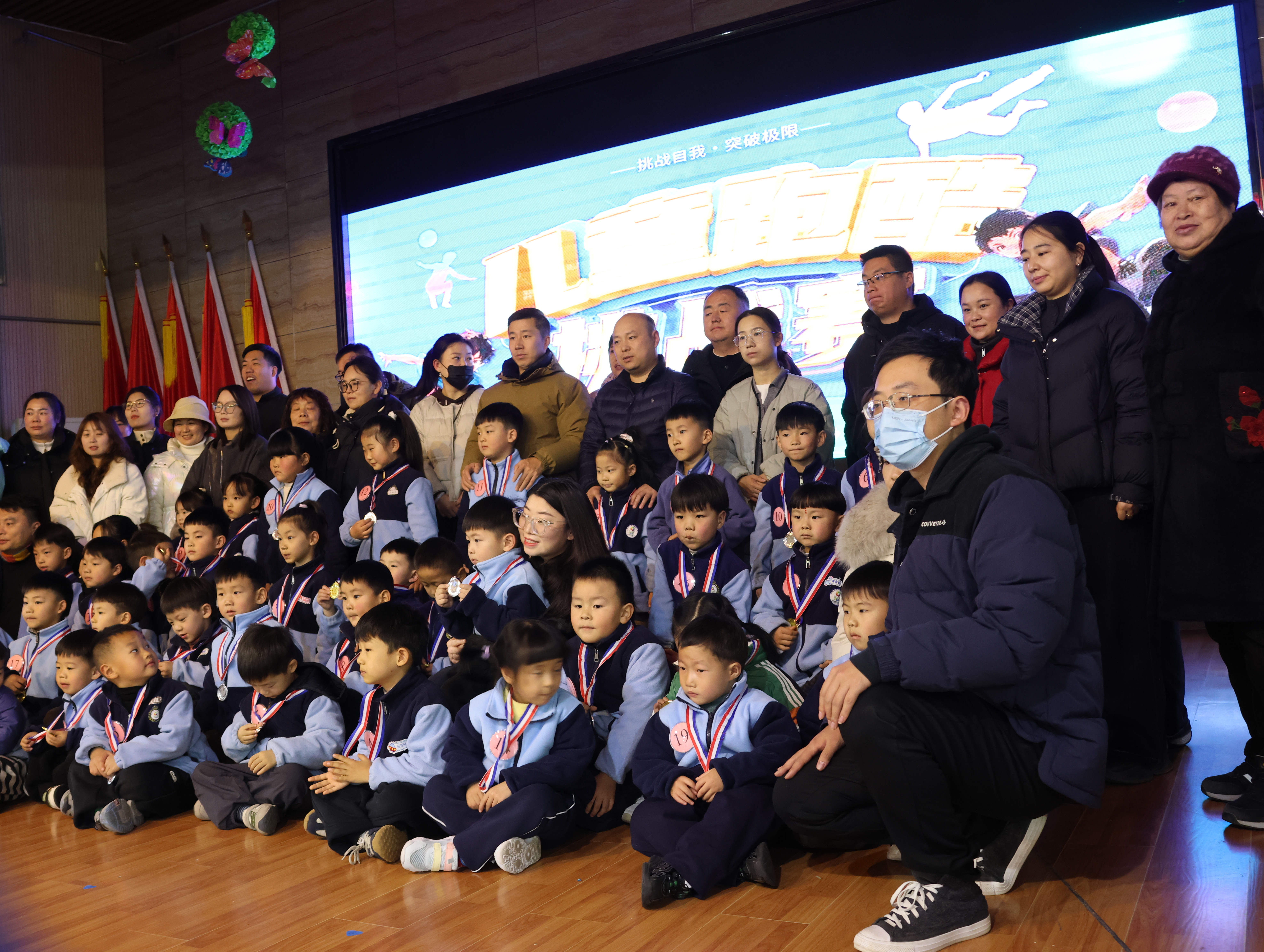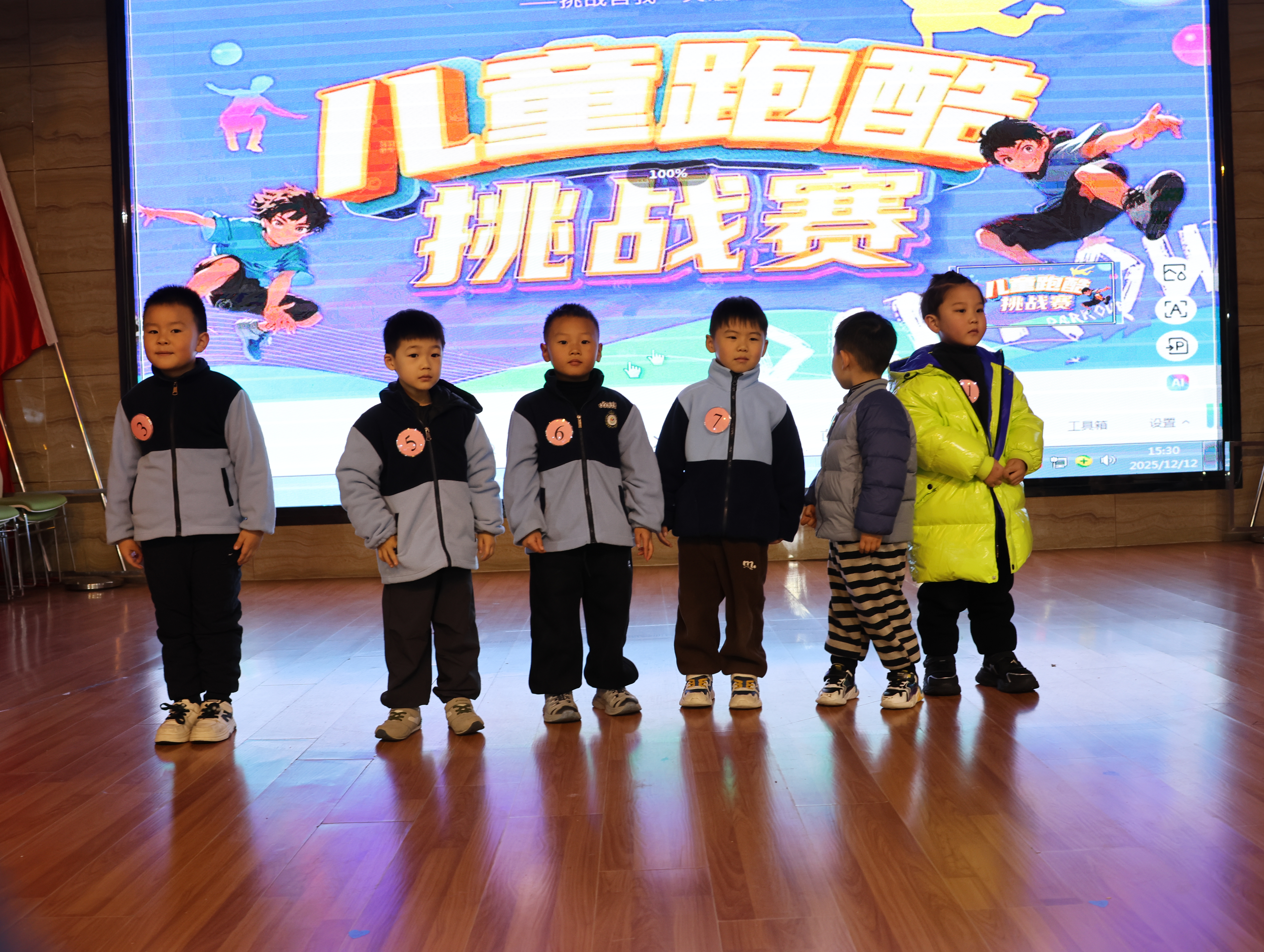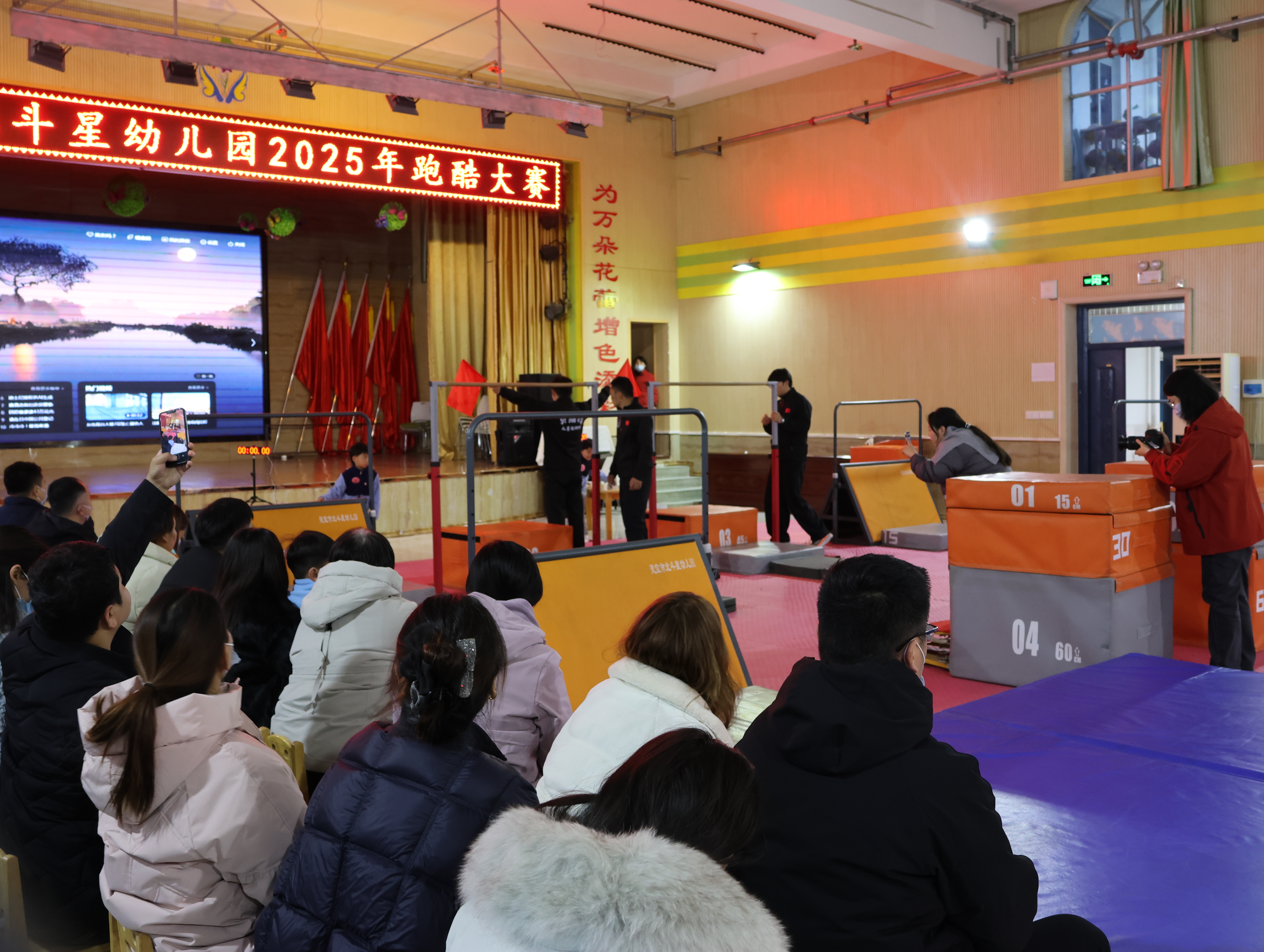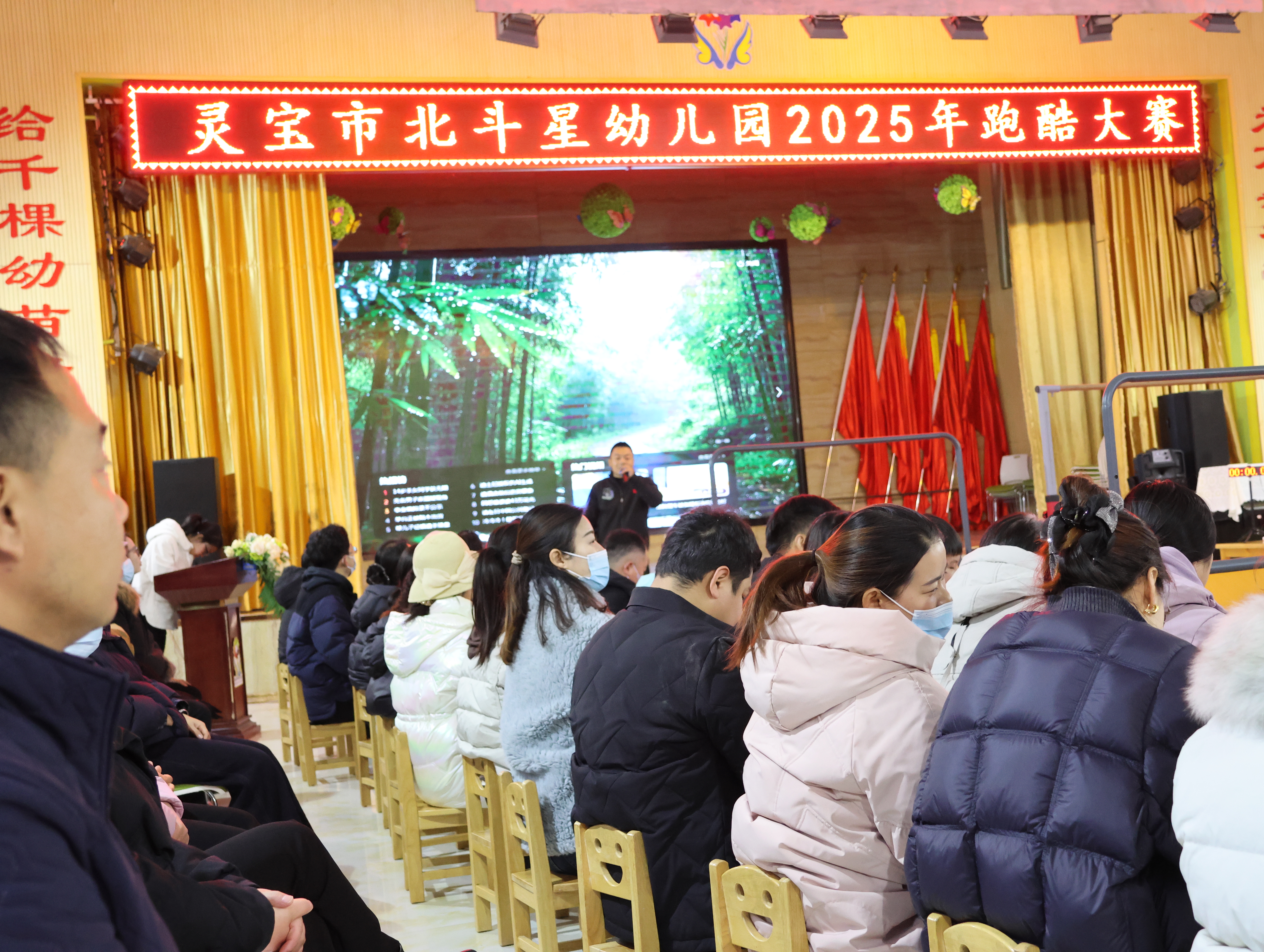 2025年12月12日下午三點,靈寶市北斗星幼兒園大禮堂暖意融融,窗外細密的雪粒正打著旋兒飄落。我揣著滿電的相機和手機,搓了搓凍得發僵的手,早早搶占靠前位置——鏡頭對準跑道入口,絕不能錯過外孫登場的瞬間。“勇敢奔跑,快樂成長”的舞臺后墻屏幕格外醒目,家長們的交談聲混著孩子的嬉鬧,滿是活力。我鄰座的寶媽正調試支架,后排老友老張舉著老花鏡查賽程,我倆相視一笑——手里的設備都早已“嚴陣以待”。