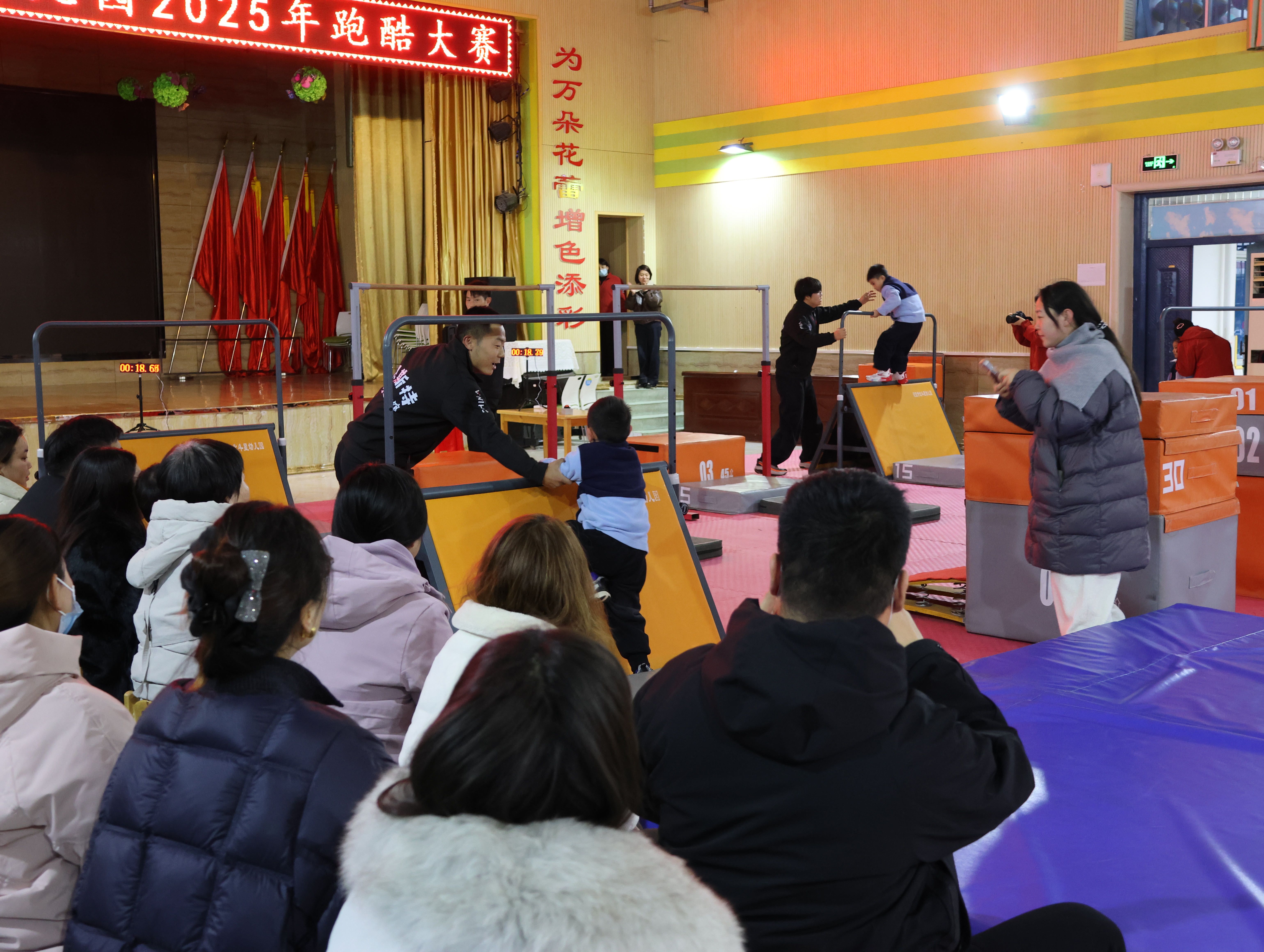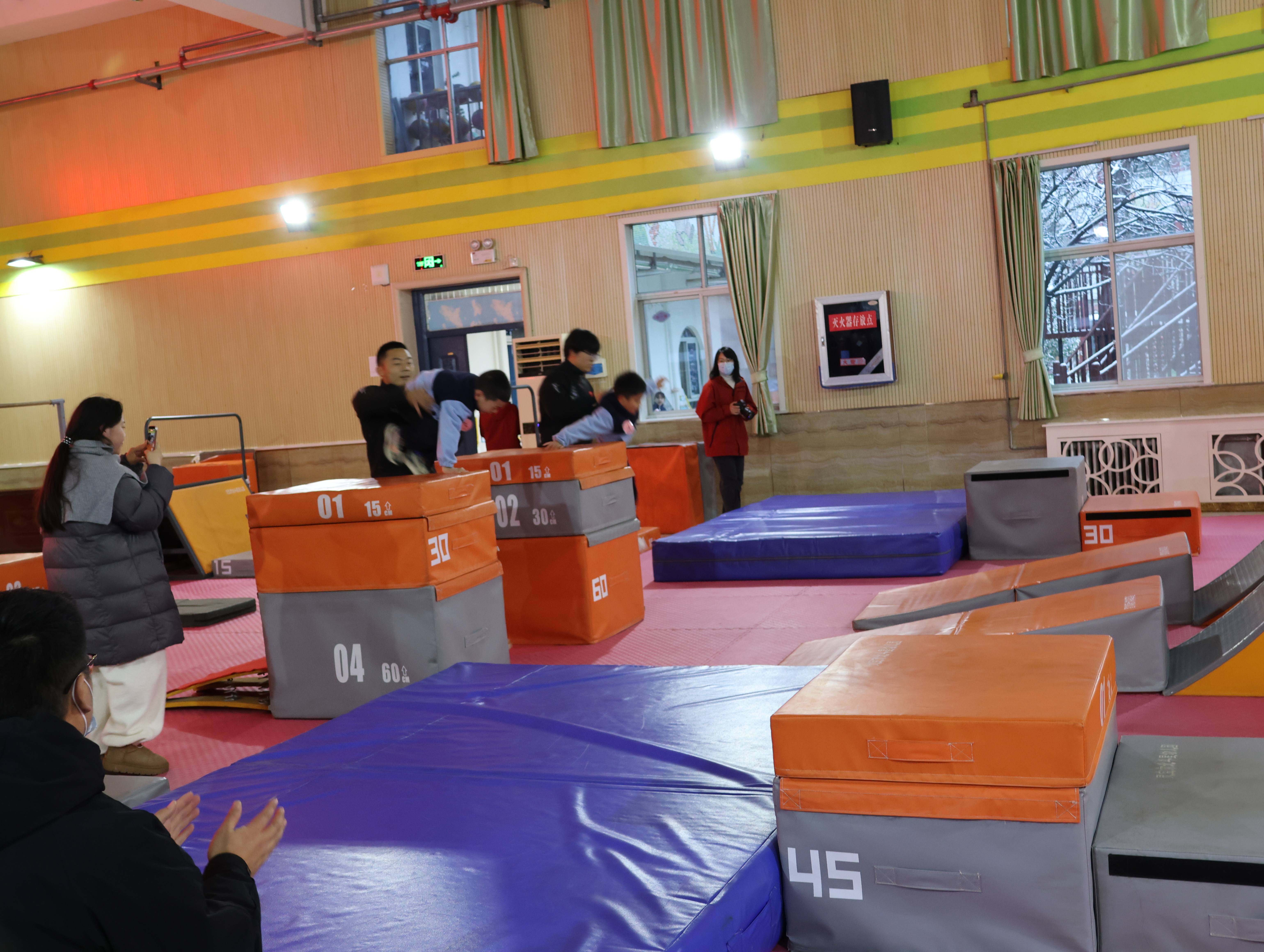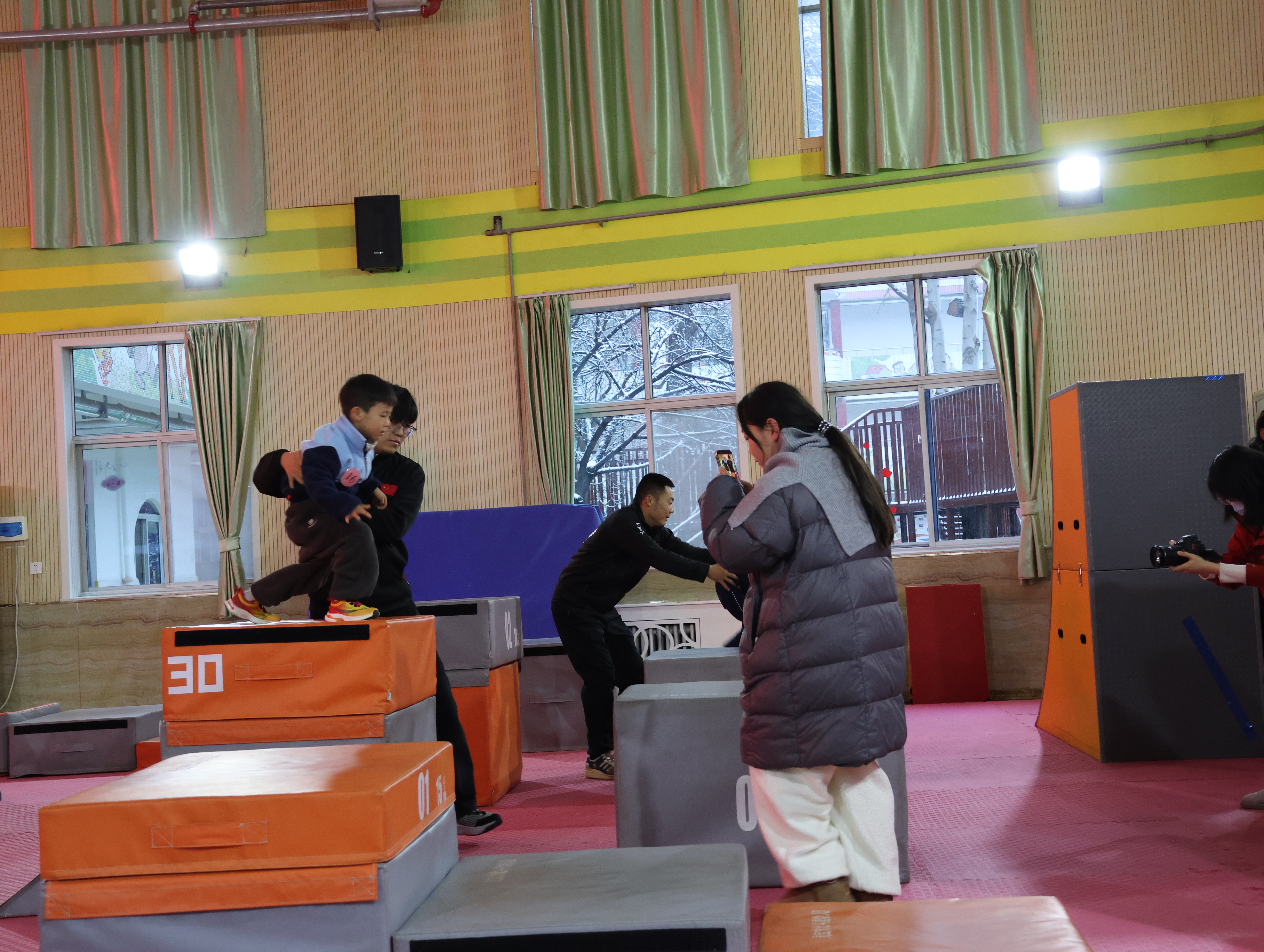 音樂起,快門聲便沒停。穿淺藍色運動服的外孫排在其中,和其他小朋友鼻尖泛著室外帶來的紅,卻回頭沖我用力揮手。哨響后他如小兔般竄出,跨墩、爬平衡臺動作穩當,額角汗珠都透著勁兒。家長們比孩子還投入:左邊媽媽邊拍邊喊“加油”,呵出的白氣模糊了鏡頭;前排爸爸攥緊拳頭緊盯賽場。我交替用相機拍全景、手機錄視頻,手指凍僵也顧不上搓——生怕漏過他跳躍的發梢、沖線的笑容。有個小男孩趔趄后立刻穩住,全場掌聲雷動,滿是包容與鼓勵。