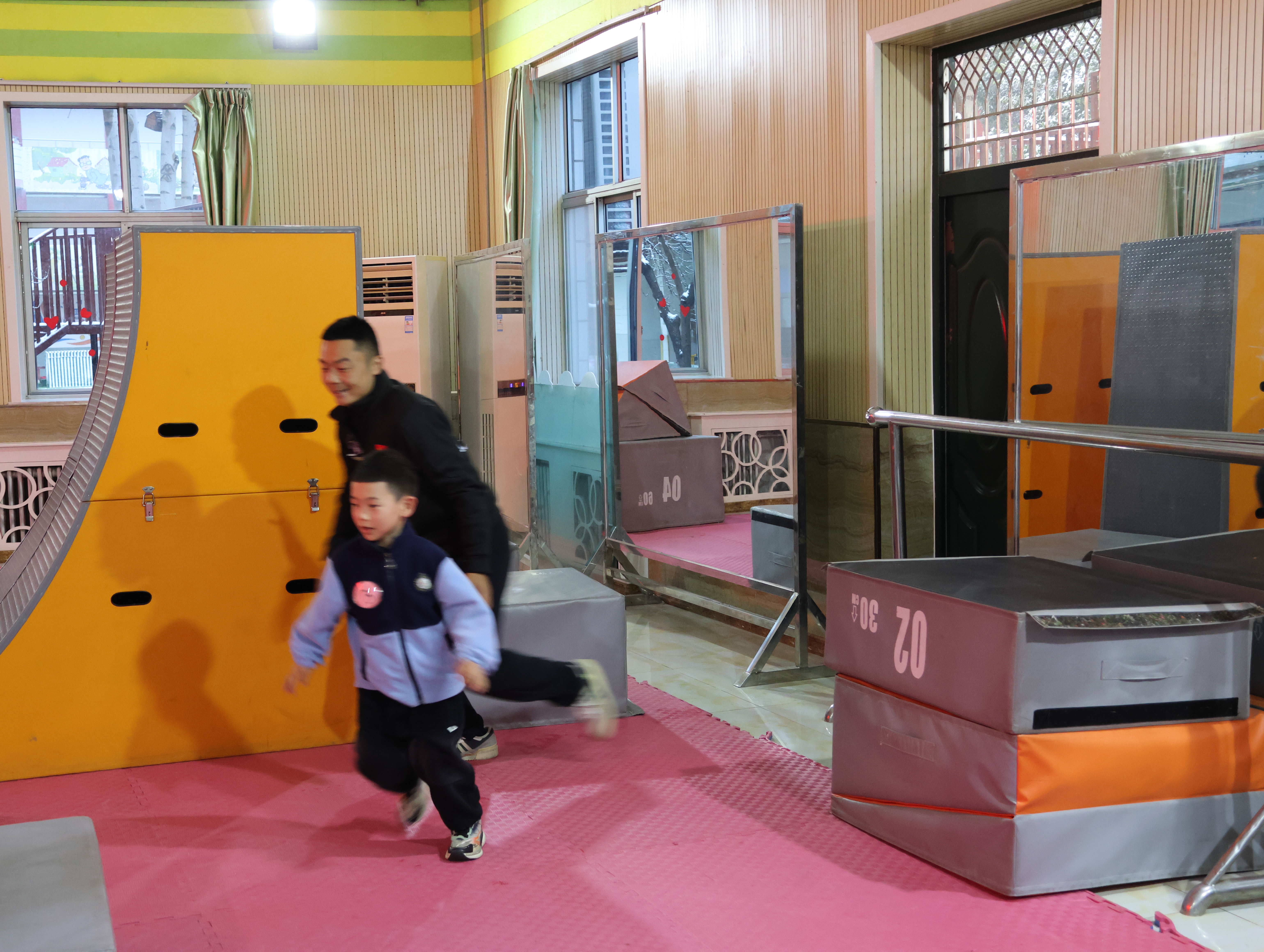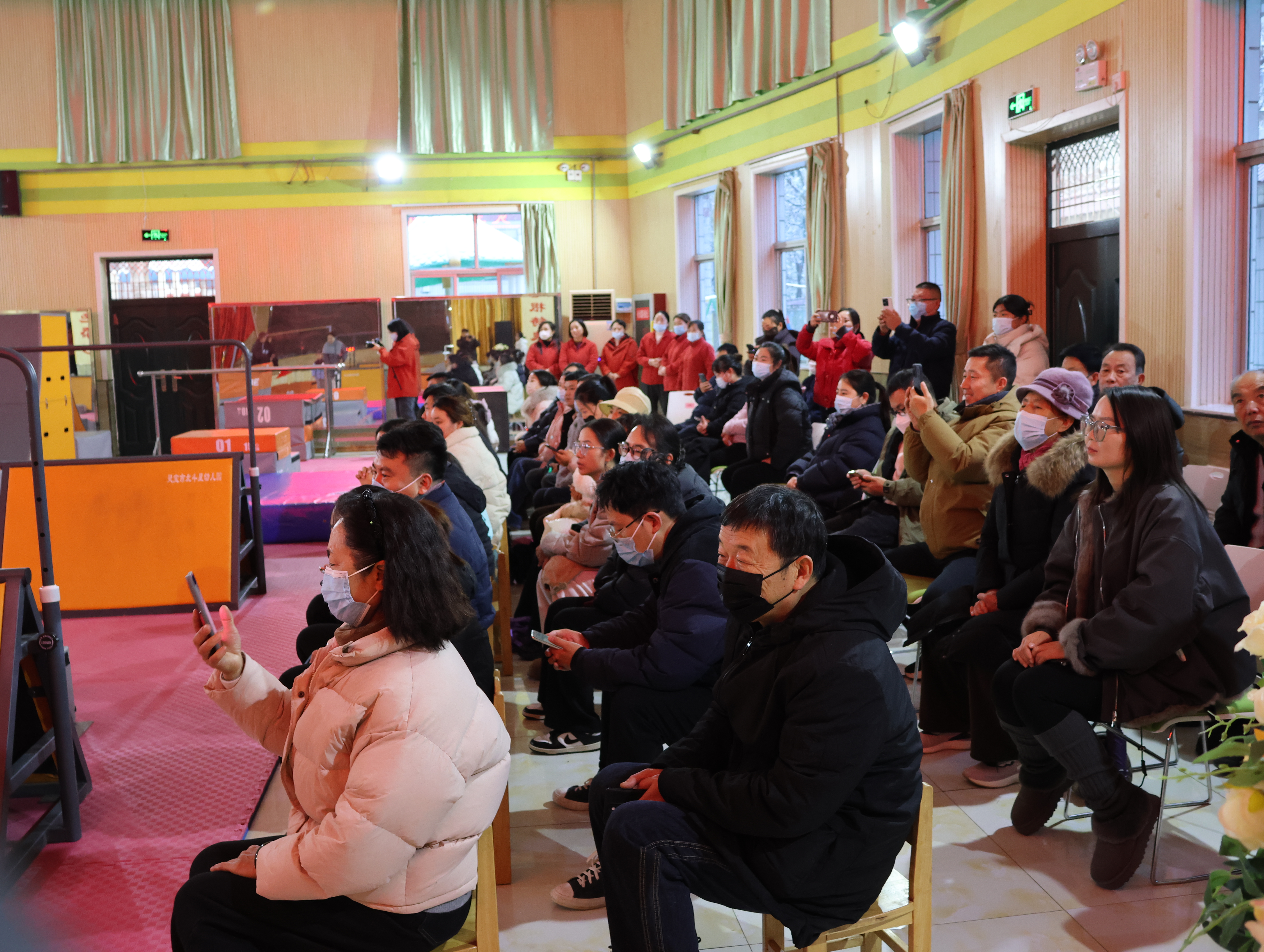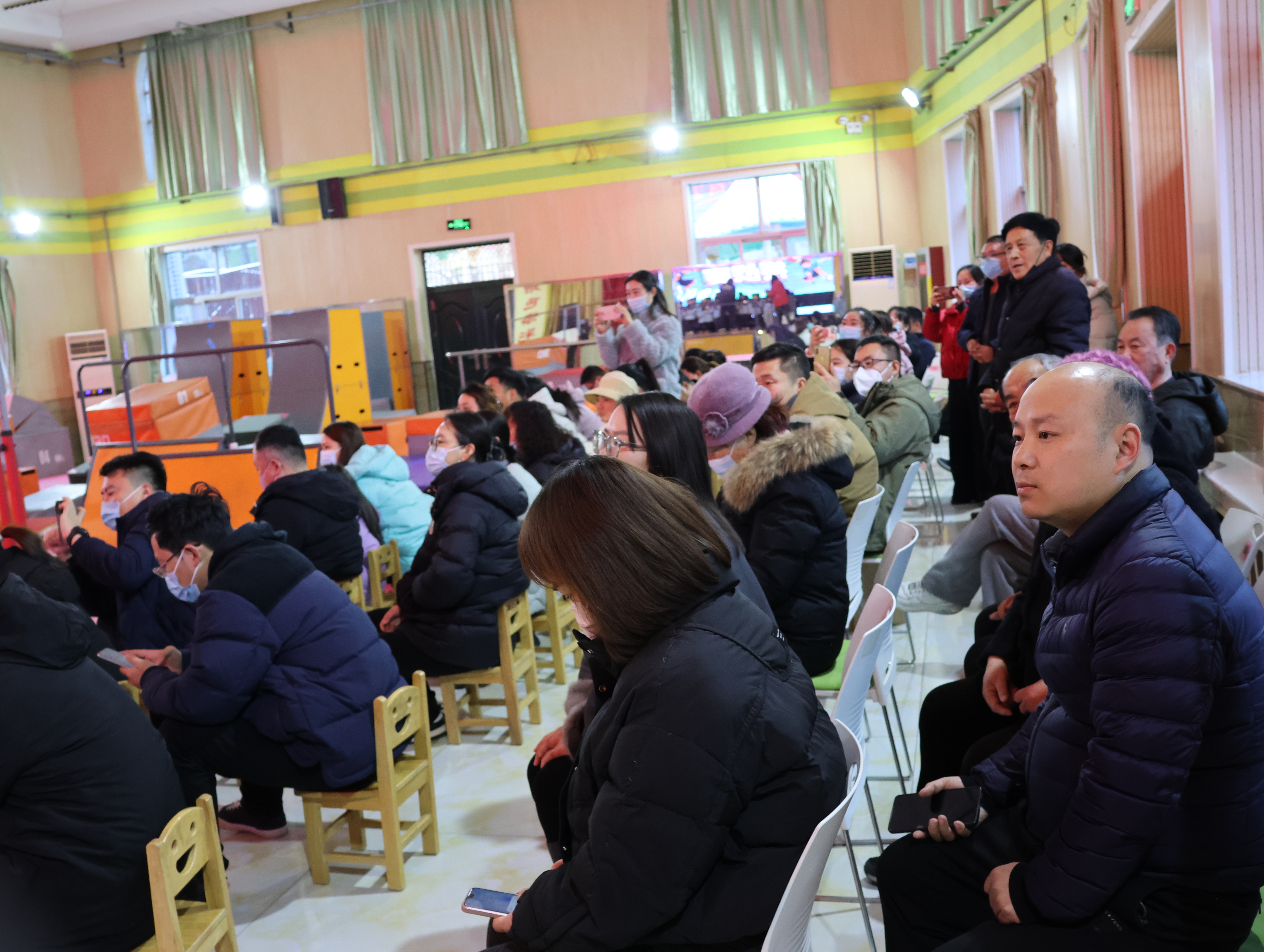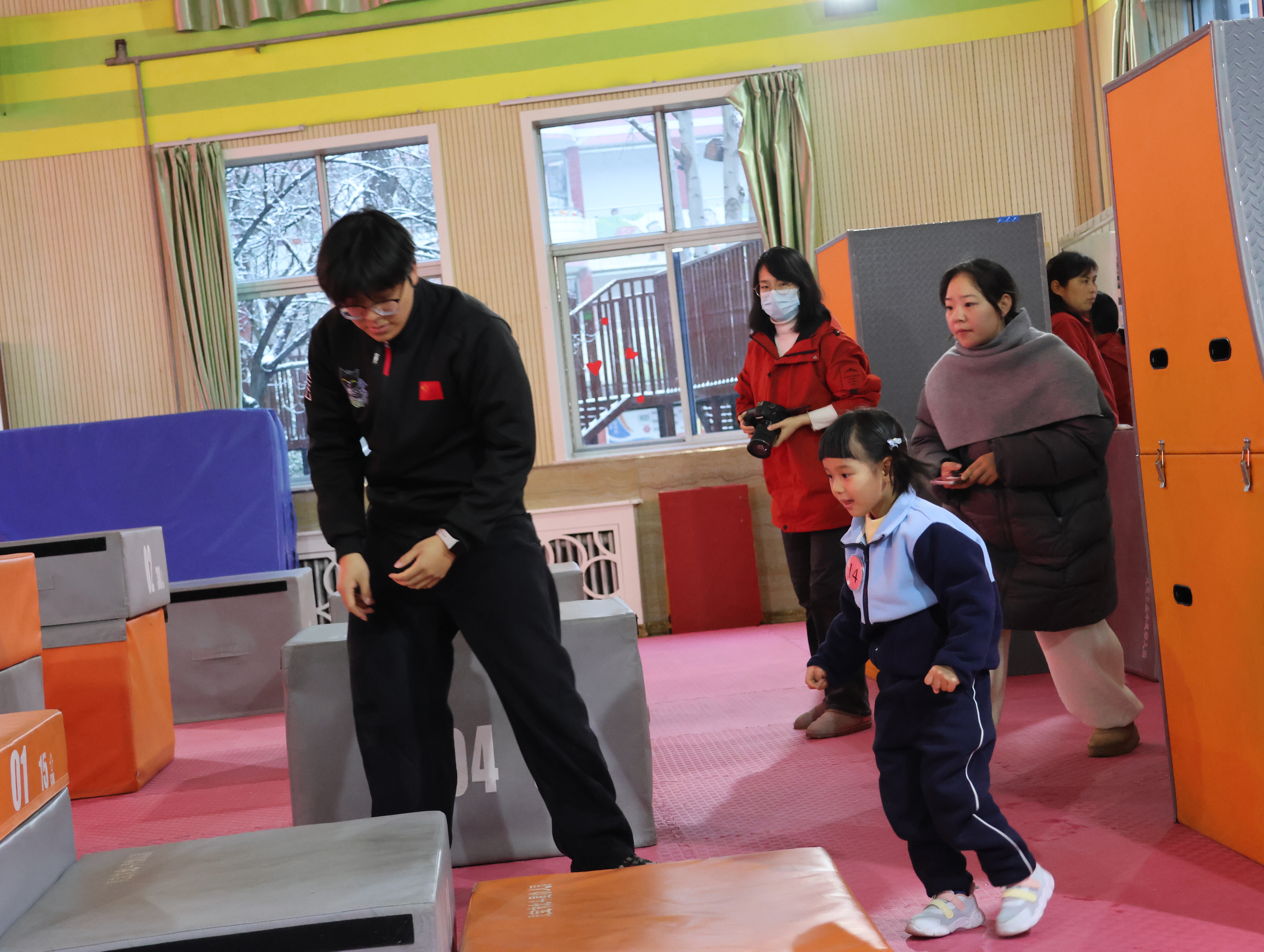音樂起,快門聲便沒停。穿淺藍色運動服的外孫排在其中,和其他小朋友鼻尖泛著室外帶來的紅,卻回頭沖我用力揮手。哨響后他如小兔般竄出,跨墩、爬平衡臺動作穩當,額角汗珠都透著勁兒。家長們比孩子還投入:左邊媽媽邊拍邊喊“加油”,呵出的白氣模糊了鏡頭;前排爸爸攥緊拳頭緊盯賽場。我交替用相機拍全景、手機錄視頻,手指凍僵也顧不上搓——生怕漏過他跳躍的發梢、沖線的笑容。有個小男孩趔趄后立刻穩住,全場掌聲雷動,滿是包容與鼓勵。