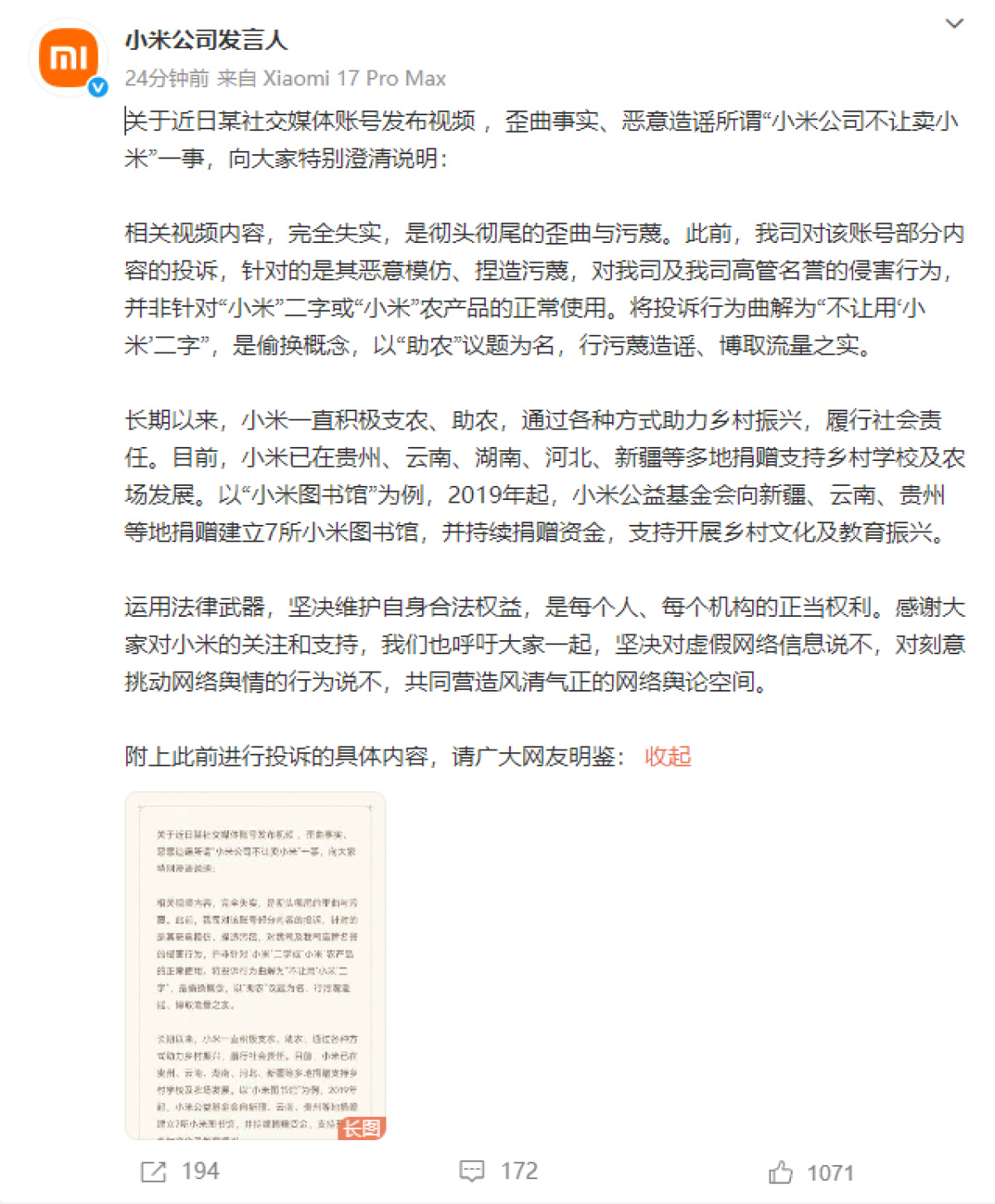 12日下午4點51分,“小米公司發言人”在微博發文稱,相關視頻內容,完全失實,是徹頭徹尾的歪曲與污蔑。此前,公司對該賬號部分內容的投訴,針對的是其惡意模仿、捏造污蔑,對公司及公司高管名譽的侵害行為,并非針對“小米”二字或“小米”農產品的正常使用。將投訴行為曲解為“不讓用‘小米’二字”,是偷換概念,以“助農”議題為名,行污蔑造謠、博取流量之實。與此同時,“小米公司發言人”還將此前投訴馮某寬的具體內容附上。