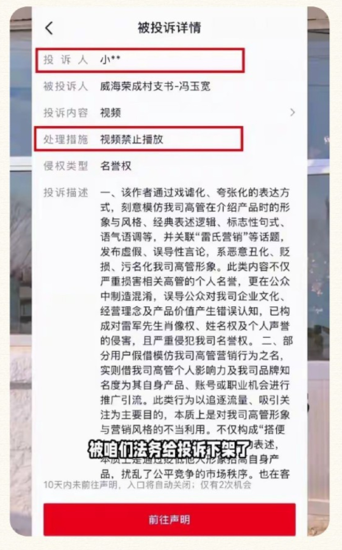 小米公司的投訴描述為,“該作者通過戲謔化、夸張化的表達方式,刻意模仿我司高管在介紹產品時的形象與風格、經典表述邏輯、標志性句式、語氣語調等,并關聯‘雷氏營銷’等話題,發布虛假、誤導性言論,系惡意丑化、貶損、污名化我司高管形象……已構成對雷軍先生肖像權、姓名權及個人聲譽的侵害,且嚴重侵犯我司名譽權等”。