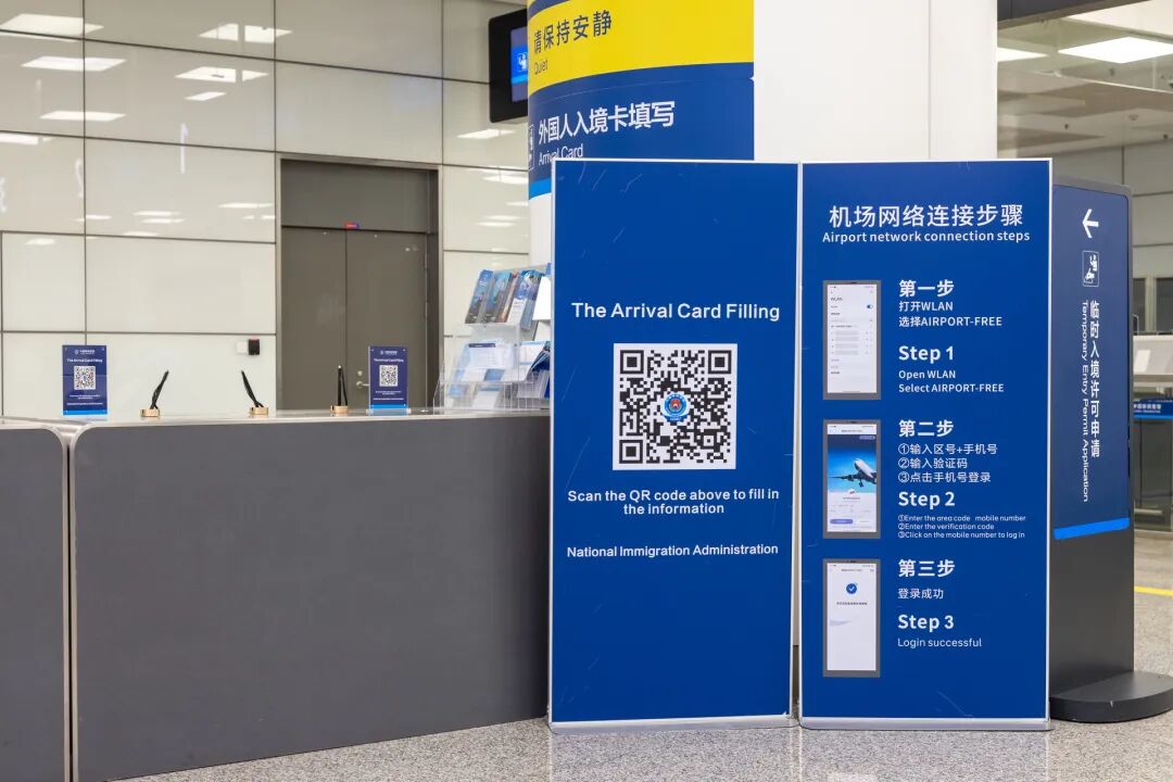 在鄭州新鄭國際機場的邊檢區(qū)域,兩個醒目的指示板立在執(zhí)勤現(xiàn)場。一面是直達(dá)線上填報頁的二維碼,另一面則清晰標(biāo)注著機場Wi-Fi的連接步驟。