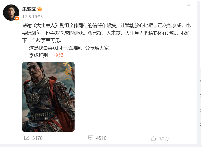 朱亞文告別李成是在角色下線那天,他感謝劇組的信任,也感謝喜歡李成的觀眾。分享了他最喜歡的一張劇照給大家。
