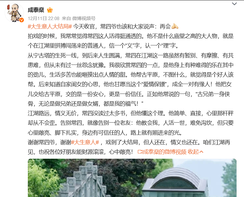 常四爺的飾演者成泰燊也發文告別,他說常四這人活的通透,不是廟堂之高的大人物,就只是在江湖里拼搏闖蕩的普通人,信義認理。