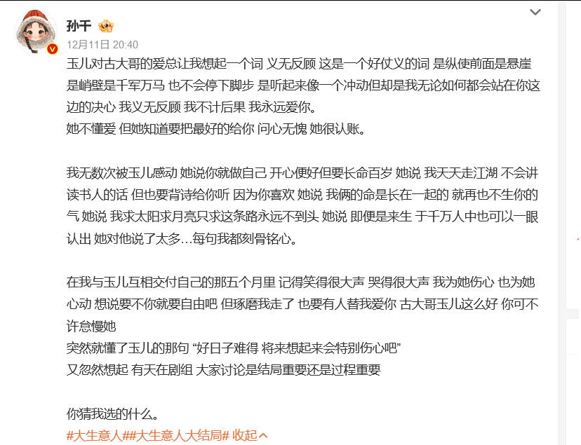 孫千發文告別常玉兒,她總結了玉兒對古大哥的愛,是義無反顧的。縱使前路是懸崖峭壁,是千軍萬馬也不會停下腳步。是聽起來像一個沖動但卻是我無論如何都會站在你這邊的決心,我義無反顧,不計后果,我永遠愛你。
