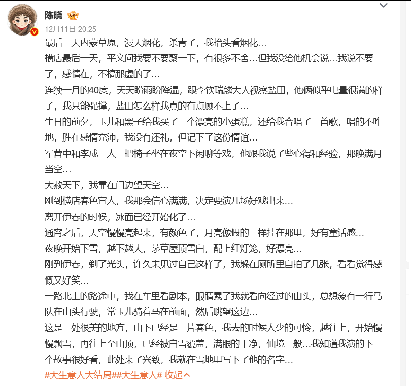 陳曉發文告別古平原,他采用倒敘的方式,總結自己在整個拍戲的過程。這部劇轉戰內蒙草原、橫店、伊春等多地。陳曉在這些地方都發生了趣事,那些跟古平原相處的日子,跟劇中角色互相探討的日子,成為了他懷念的。