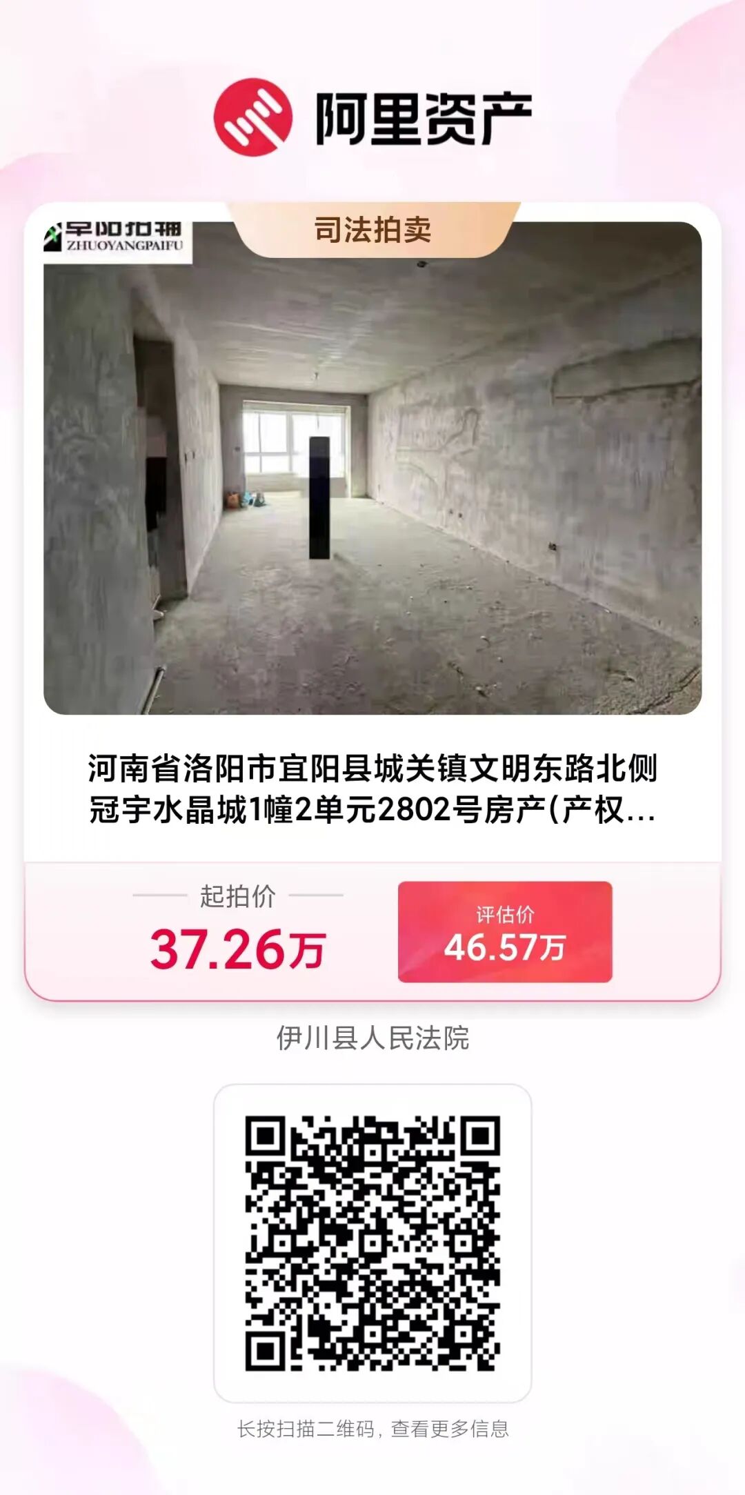 標的:河南省洛陽市宜陽縣城關鎮文明東路北側冠宇水晶城1幢2單元2802號房產(產權證號:20210007473號)
