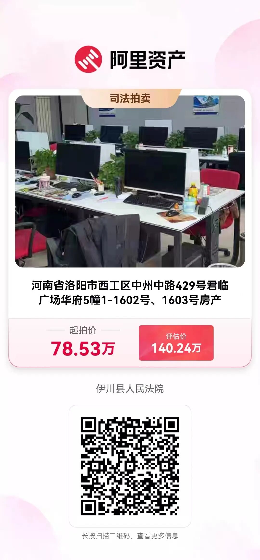 標的:河南省洛陽市西工區中州中路429號君臨廣場華府5幢1-1602號、1603號房產