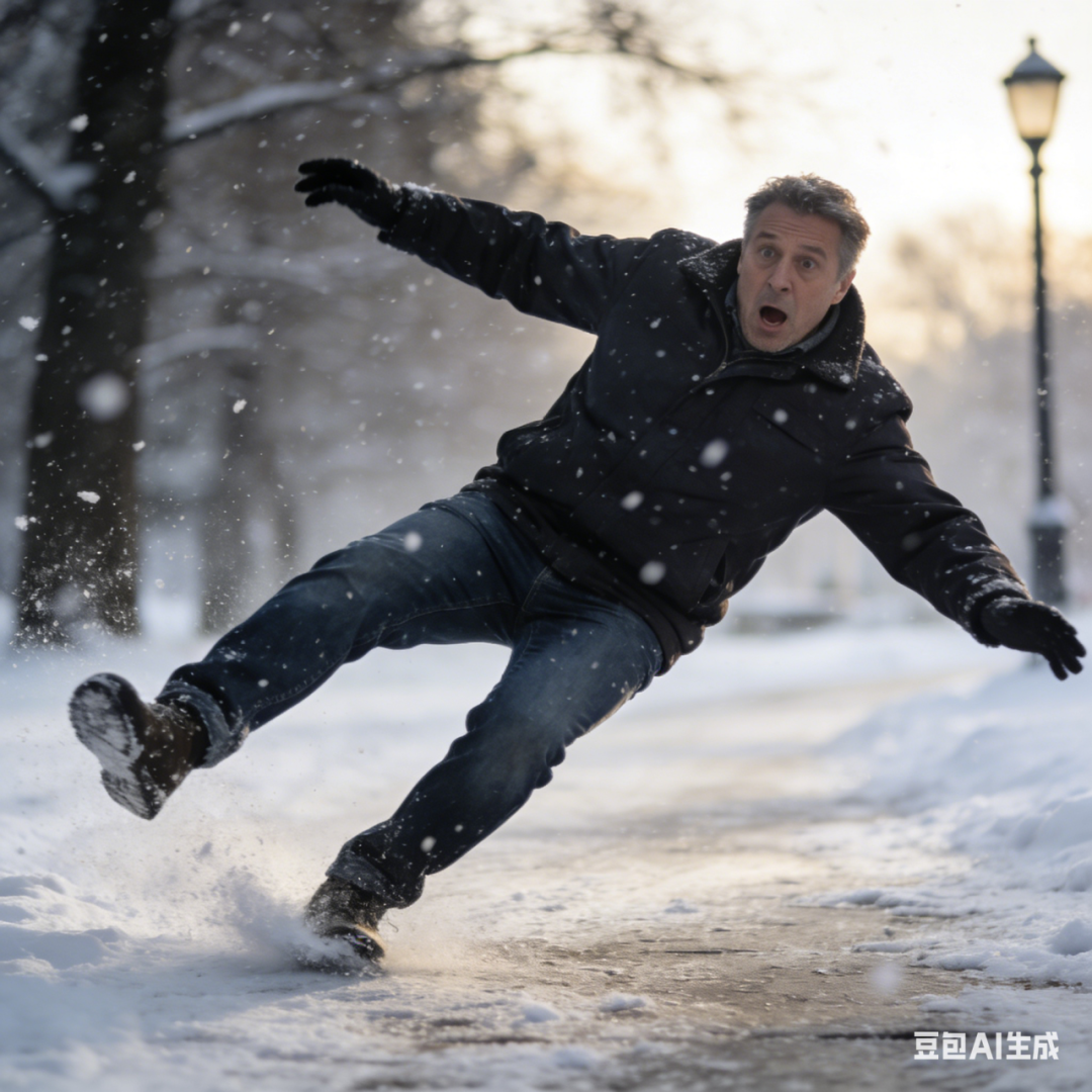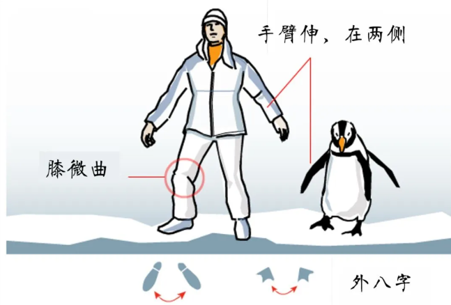 在濕滑路面建議走“企鵝步”,全腳掌著地,小步慢行,保持固定步調,雙手來回擺動,保持平衡哦~