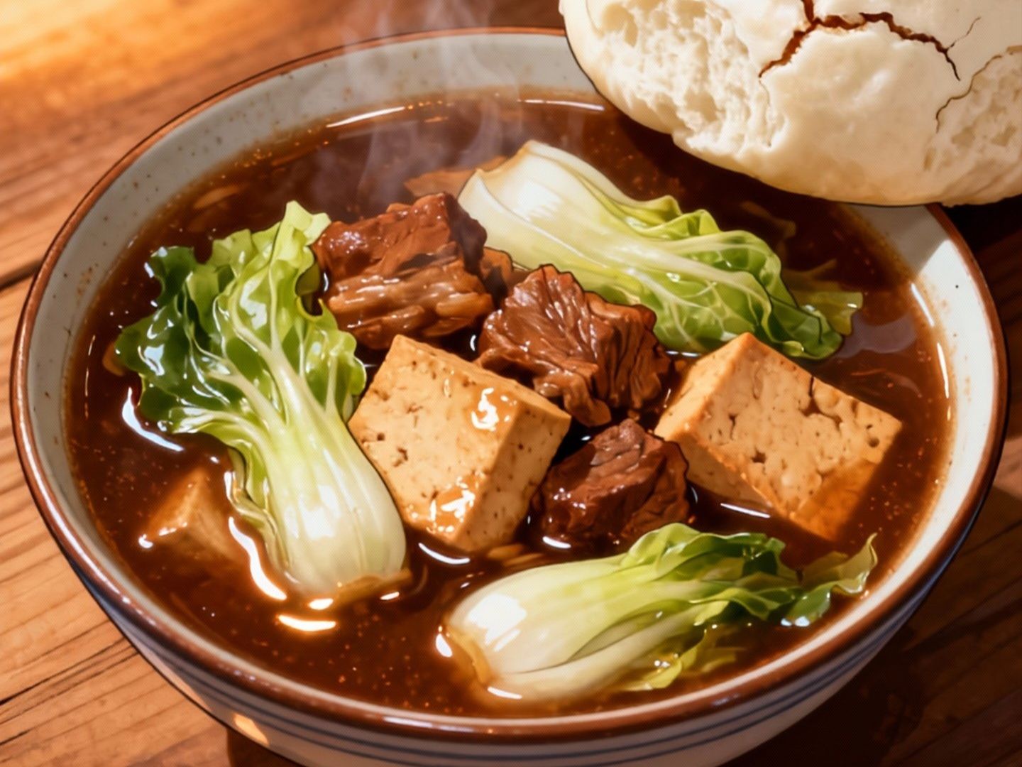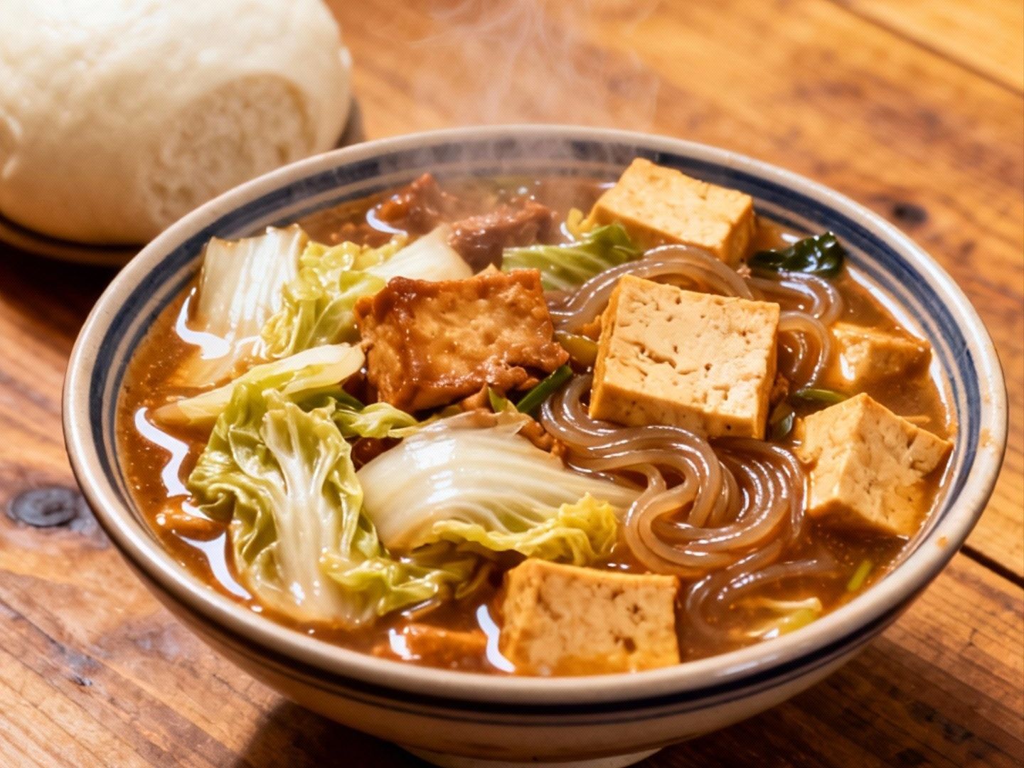 第一口要咬得實(shí)在,牙齒先陷進(jìn)暄軟的饅頭芯,接著觸到滾燙的熬菜。湯汁瞬間浸潤(rùn)了麥芽的甜,肉香撞上糧食的樸,粉條的滑、豆腐的糯、白菜的爛,都在這一口里團(tuán)圓了。不用細(xì)品,那味道是粗糲的、踏實(shí)的,直接往胃里墜,墜出個(gè)熱乎乎的滿足來(lái)。