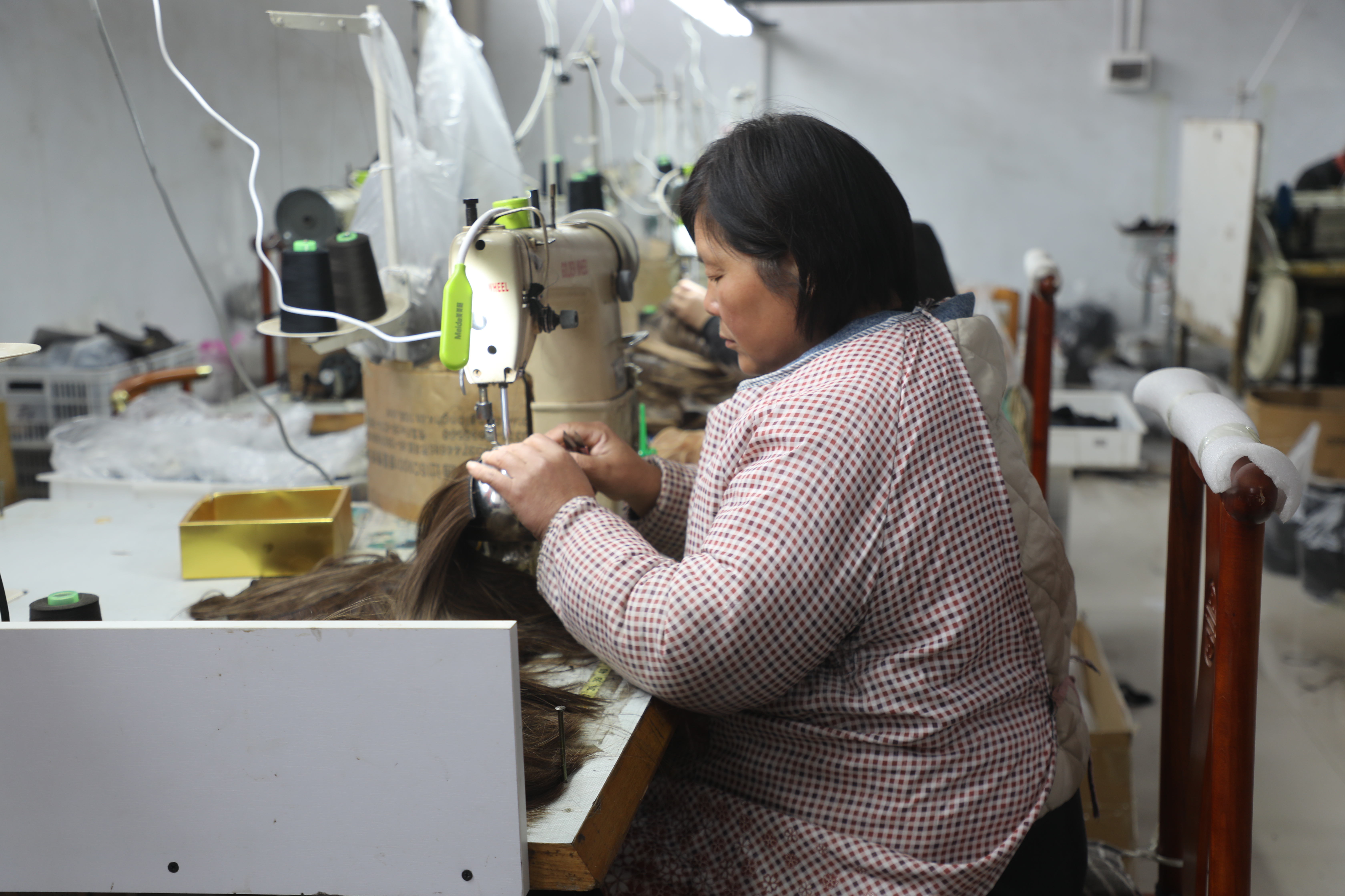 建安區(qū)五女店鎮(zhèn)許莊村檔發(fā)加工點(diǎn)工人在加工檔發(fā)產(chǎn)品 何煒攝