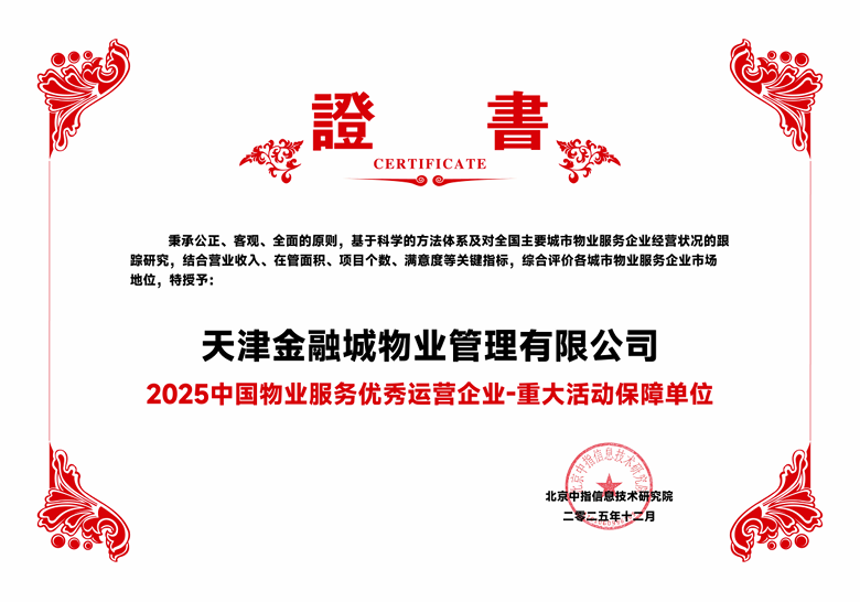 天津金融城物業管理有限公司榮獲“2025中國物業服務優秀運營企業-重大活動保障單位”獎項。