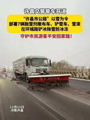 12月12日,河南許昌。警車開道,許昌市公路事業發展中心以雪為令,部署融雪劑撒布車、鏟雪車、雪滾等在環城路鏟冰除雪防冰凍。#鏟雪車 #交警 #河南天氣 #降雪 #許昌降雪 (記者:譚宜姝;編輯:李灝)