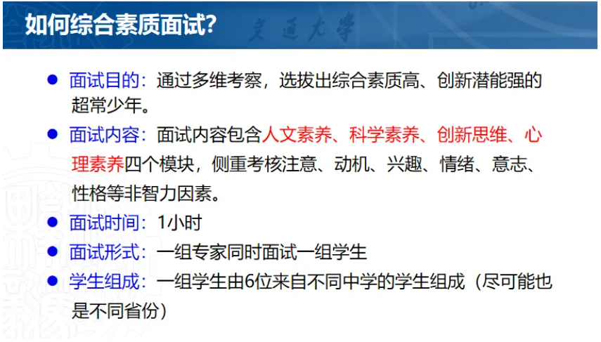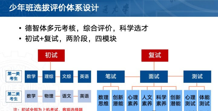 ?西交少年班選拔:除知識能力外,還重點考查學生的創新思維、科研潛力、人文素養、心理素質等綜合素質。復試環節包括面試、綜合素質測試、體能測試等,全面評估學生的綜合能力。