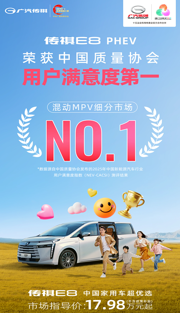 近日,中國質(zhì)量協(xié)會在北京正式發(fā)布2025年中國新能源汽車行業(yè)用戶滿意度指數(shù)(NEV-CACSI)測評結(jié)果。廣汽傳祺E8 PHEV憑借卓越的產(chǎn)品力與用戶口碑,榮獲該細分市場用戶滿意度第一。這份來自權(quán)威機構(gòu)的認可,不僅印證了傳祺E8全面領(lǐng)先的硬核實力,也標志著傳祺在新能源MPV領(lǐng)域已贏得市場與消費者的深度信賴。