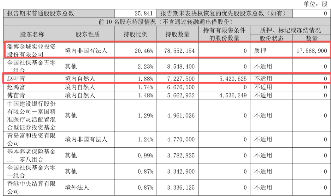 截至目前,金城醫藥控股股東為淄博金城實業投資股份有限公司(簡稱“金城實業”),持股20.46%,趙葉青通過直接及間接方式合計持有公司2.88%股權。