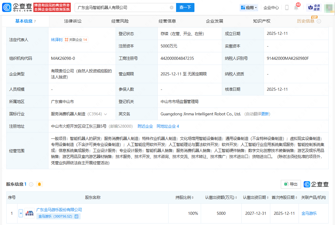 企查查APP顯示,近日,廣東金馬智能機器人有限公司成立,法定代表人為林澤釗,注冊資本5000萬人民幣,經營范圍涉及智能機器人的研發、服務消費機器人制造、特殊作業機器人制造、文化場館用智能設備制造等。企查查股權穿透顯示,該公司由金馬游樂(300756)全資持股。