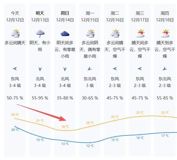 受冷空氣影響,13日陰天,有小雨,氣溫下降,北風加大,氣溫15-21℃,沿海、高地和海區最大陣風8級左右,體感轉冷;