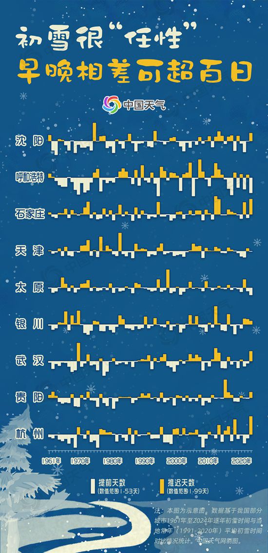 從常年平均時(shí)間來(lái)看,我國(guó)初雪基本符合自北向南“派送”的規(guī)律。不過(guò),具體到每一年,“雪花物流”的節(jié)奏卻并不穩(wěn)定,可能出現(xiàn)明顯提前或延遲。同一城市不同年份的初雪日期相差極大,甚至早晚能差百余天。早的年份,深秋彩葉尚未落盡,初雪已匆匆而至;晚的年份,直至次年二三月,春意漸萌之時(shí),初雪才姍姍來(lái)遲。