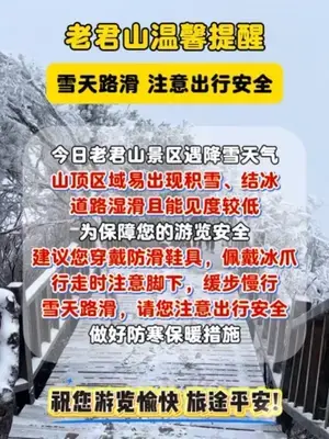 老君山溫馨提醒:雪天路滑,注意出行安全!#老君山#下雪(編輯:王怡丹 胡耀幗)