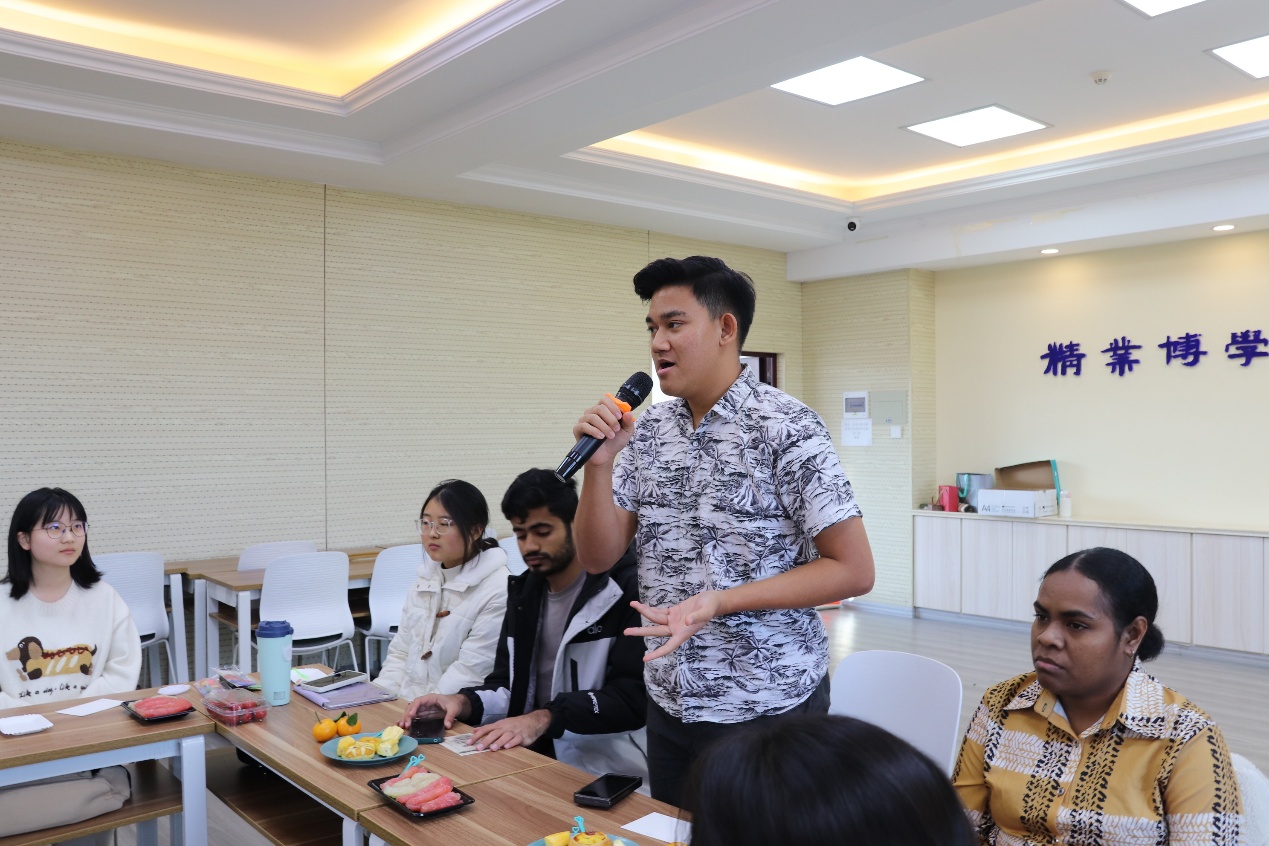 活動重點聚焦于專業研討與能力提升。在管理學科交流環節,中外學生結合課程項目、研究方向及實踐案例,分享見解、激發思考。來自巴基斯坦的留學生Adnan結合自身跨文化研究經歷,探討了中巴文化異同及其在全球化背景下的互動意義,引發熱烈討論。這一環節不僅促進了學術觀點碰撞,更有助于學生構建國際化知識體系和協作能力。