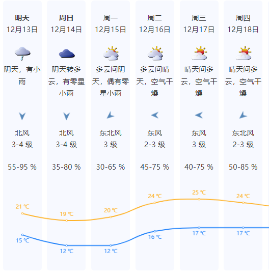 受冷空氣影響,13日陰天,有小雨,氣溫下降,北風加大,氣溫15-21℃,沿海、高地和海區最大陣風8級左右,體感轉冷。