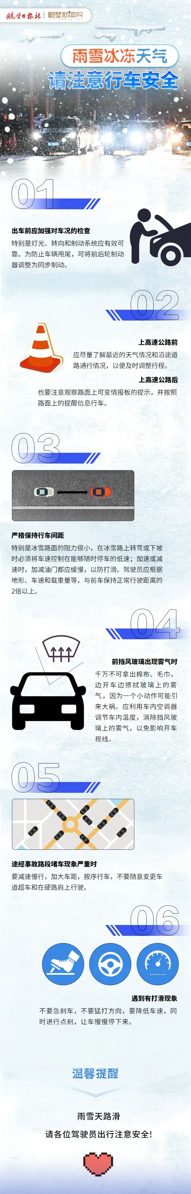 請大家務必做好防寒保暖措施,尤其是老人和兒童。雨雪天氣,盡量選擇公共交通出行。居家取暖時,務必注意用電用氣安全,防止一氧化碳中毒。