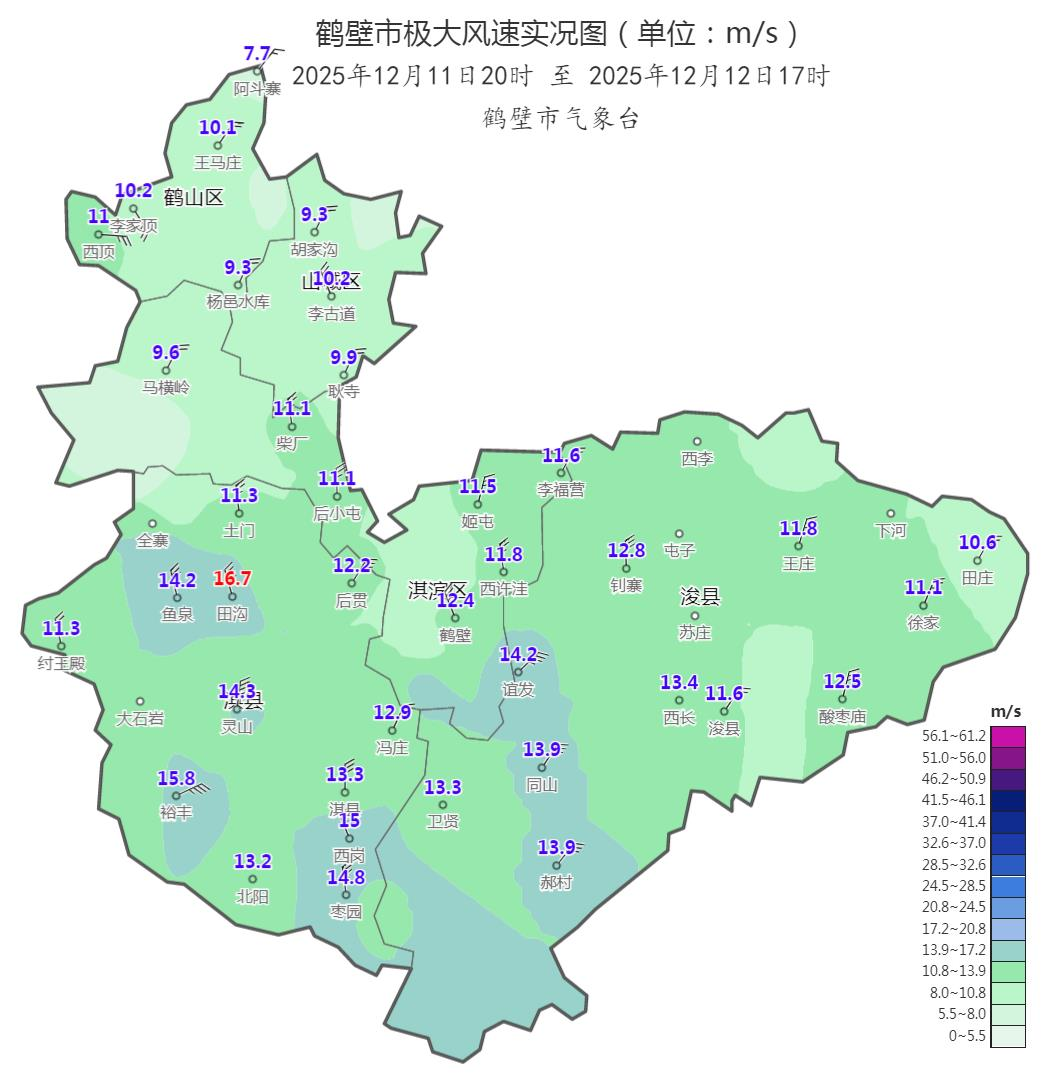 受較強冷空氣影響,12月11日20時至12日17時,我市出現大風天氣。有10個氣象觀測站點極大風速達7級以上,極大風速最大值出現在淇縣田溝站16.7米/秒。具體情況如下: