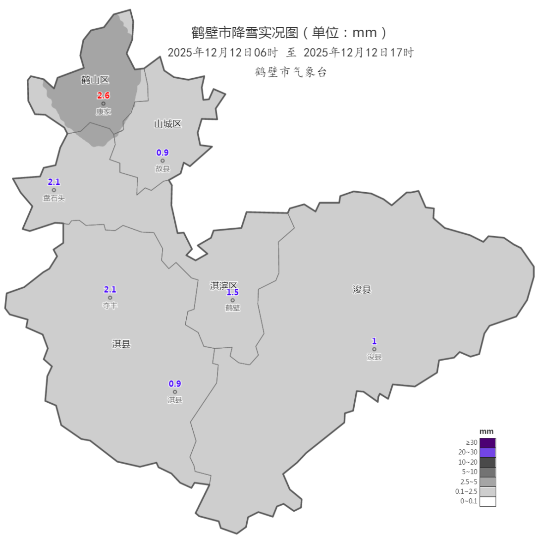 12月12日6時至17時,我市出現小到中雪天氣。降雪量最大值出現在鶴山區康家站2.6毫米,三個國家氣象觀測站降雪量分別為鶴壁站1.5毫米、淇縣站0.9毫米、浚縣站1.0毫米。積雪深度1到2厘米。具體情況如下: