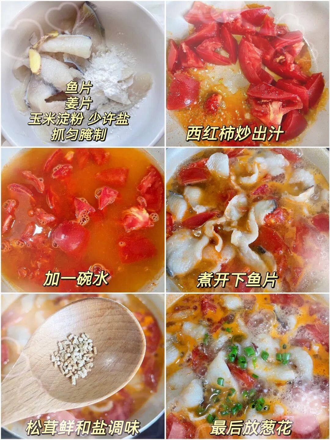200克鱈魚切成片、番茄1個、姜片3片、蔥花少許、淀粉1小勺、鹽少許、蛋清1個、松茸鮮。